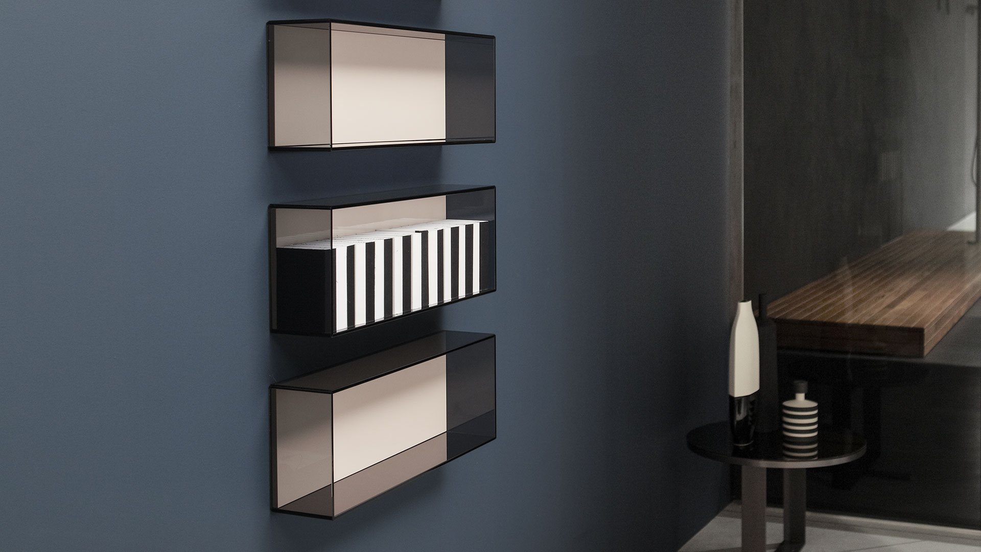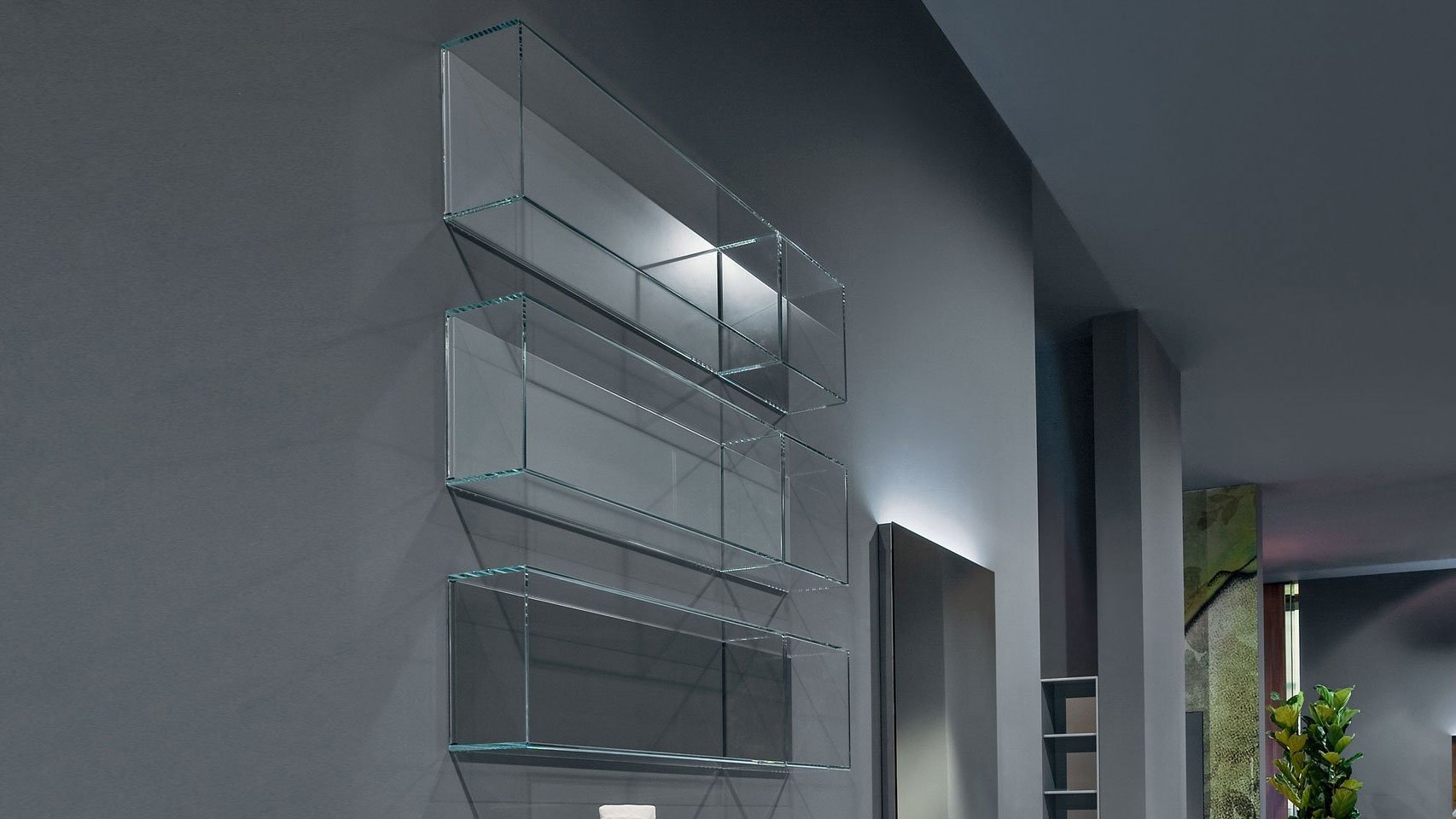 开放式壁柜采用超透明、青铜或烟熏玻璃制成,带有 1 个隔层和根据我们的色卡涂漆的背板。
