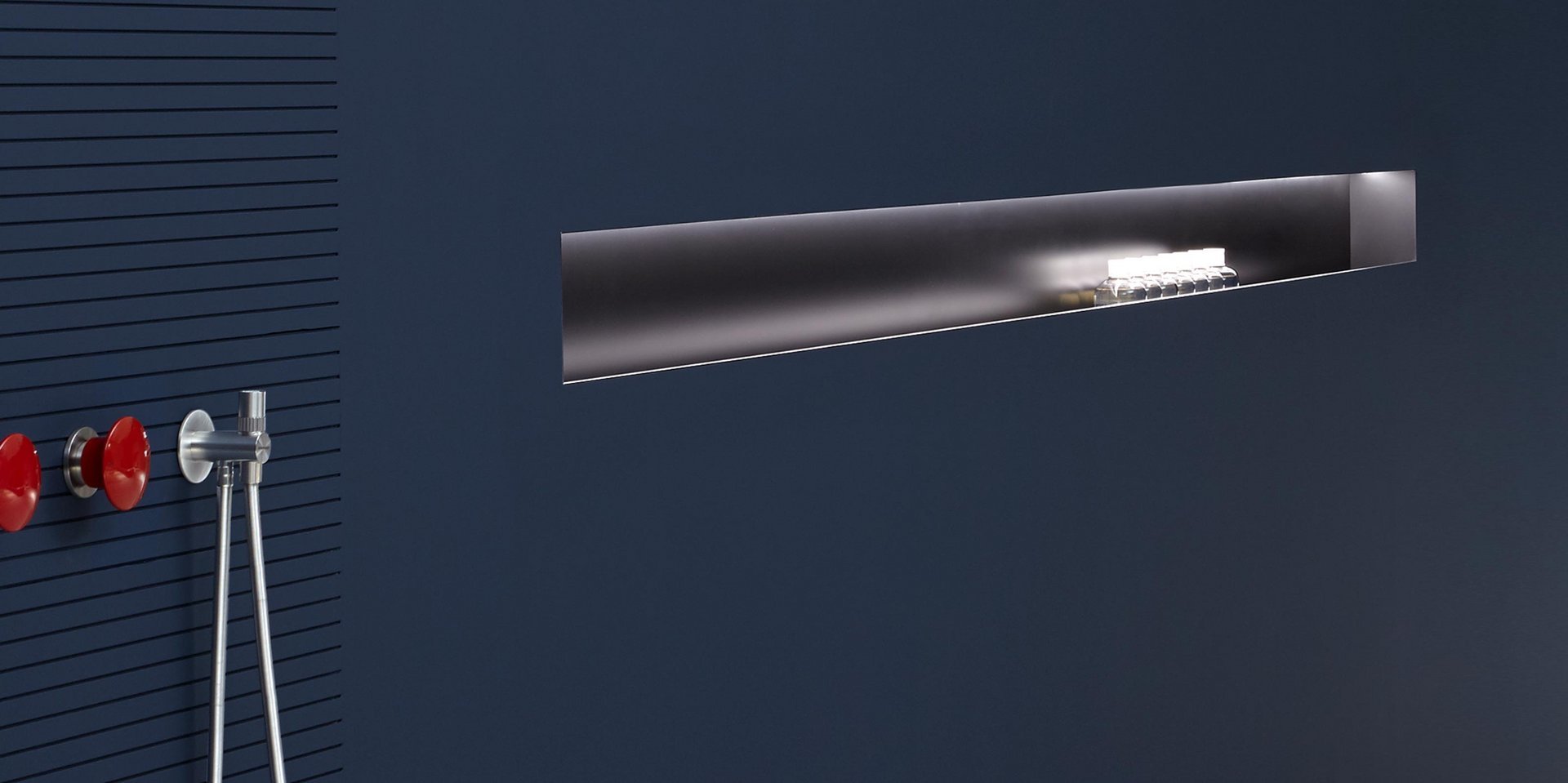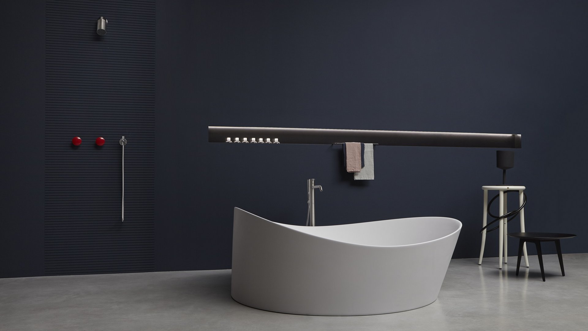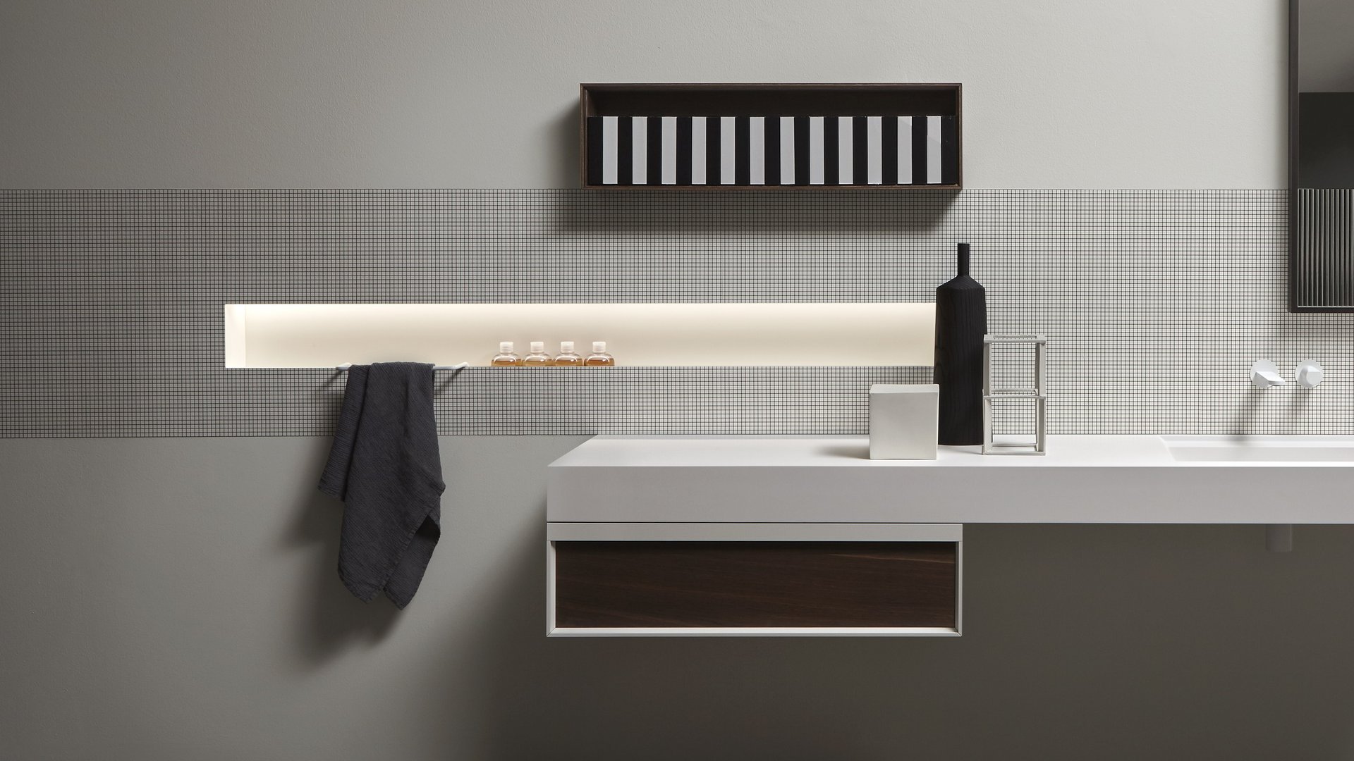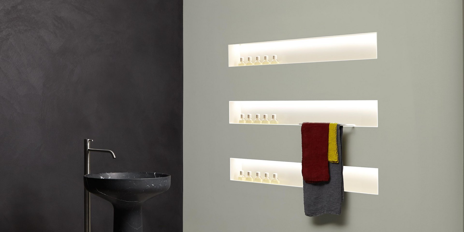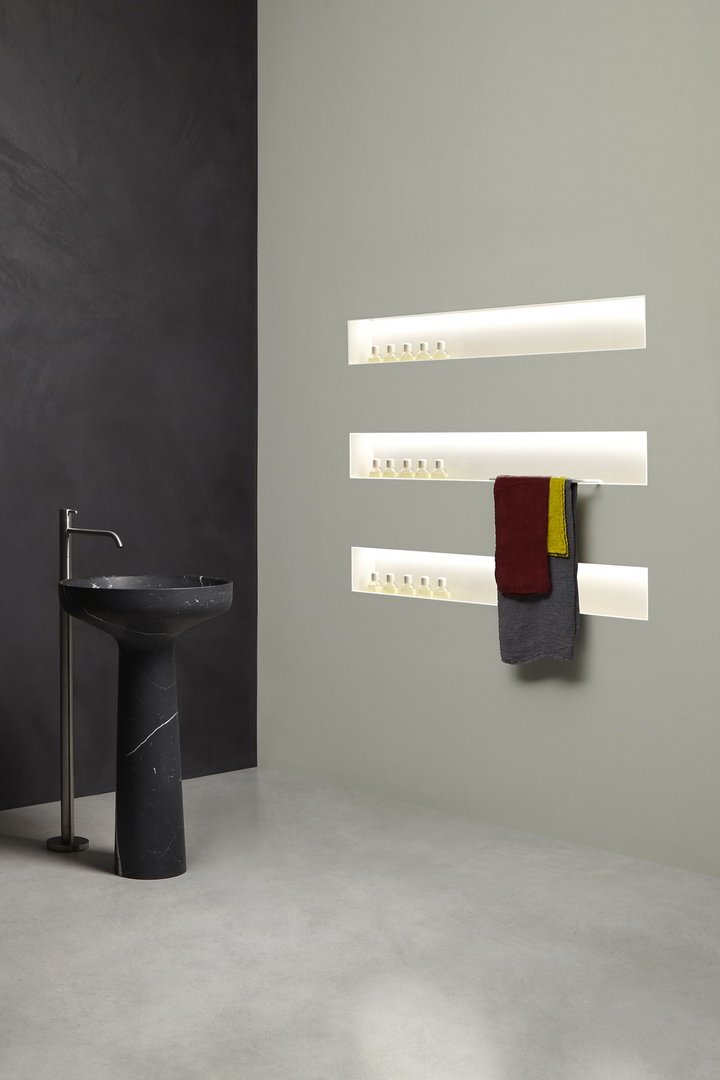 对实体和空之间关系的发挥,强调了缺席的重要性,它通过形成体积的周边表达,源于墙壁上绘制的阴影的强度,突破表面成为一个有用和优雅的容器:Ombra是从一系列涂漆铝型材中获得的配件,可让您创建一个空白空间,用于放置所有可放入浴室的物品和配件。