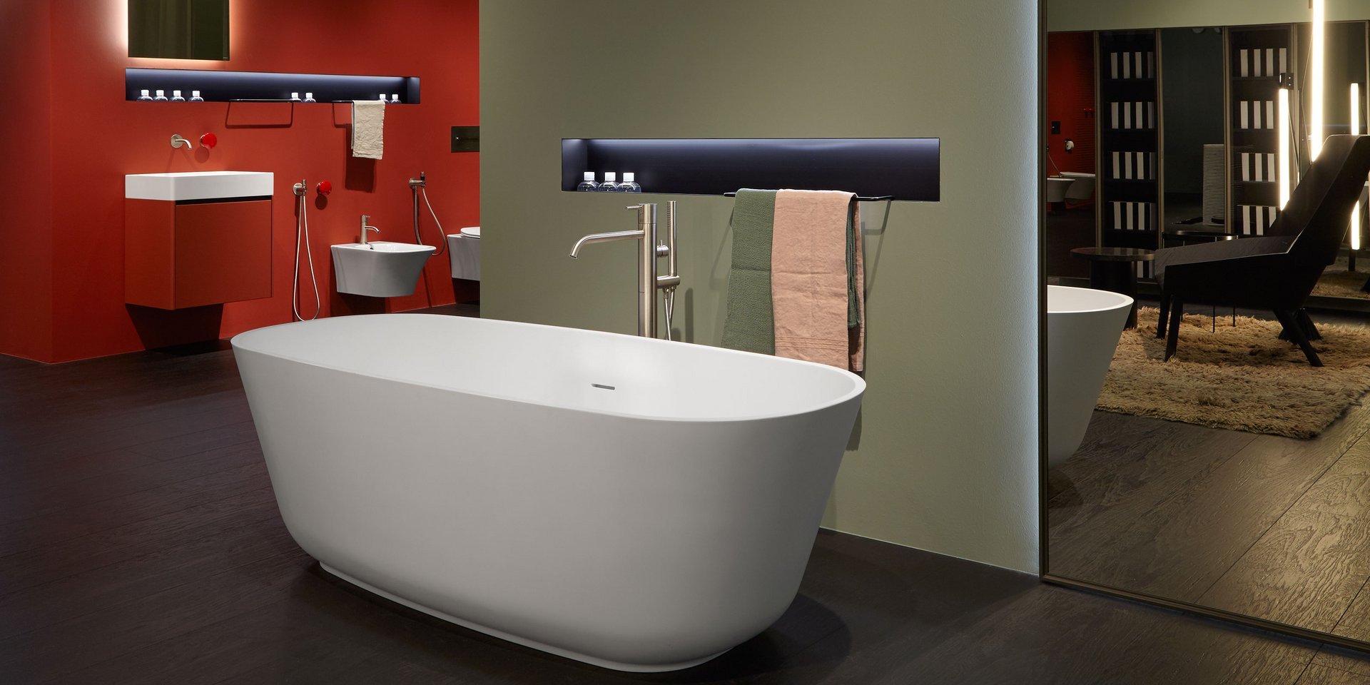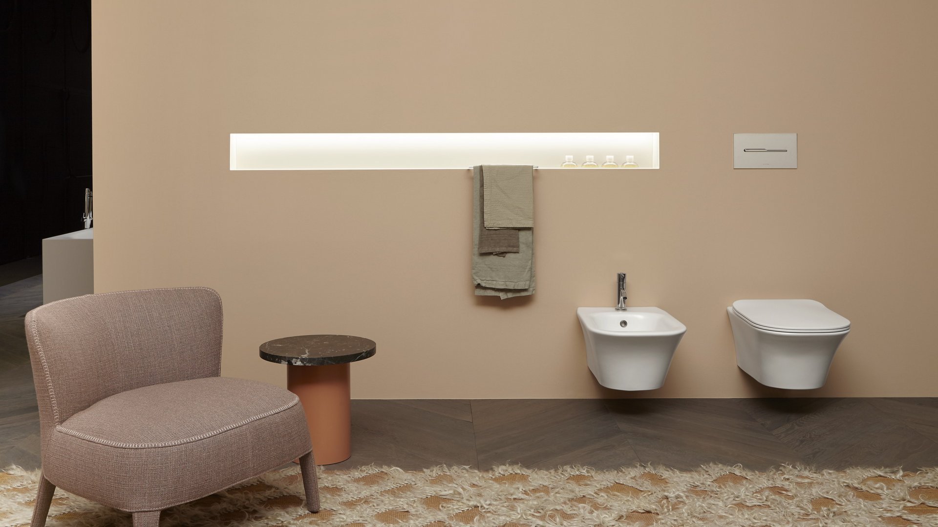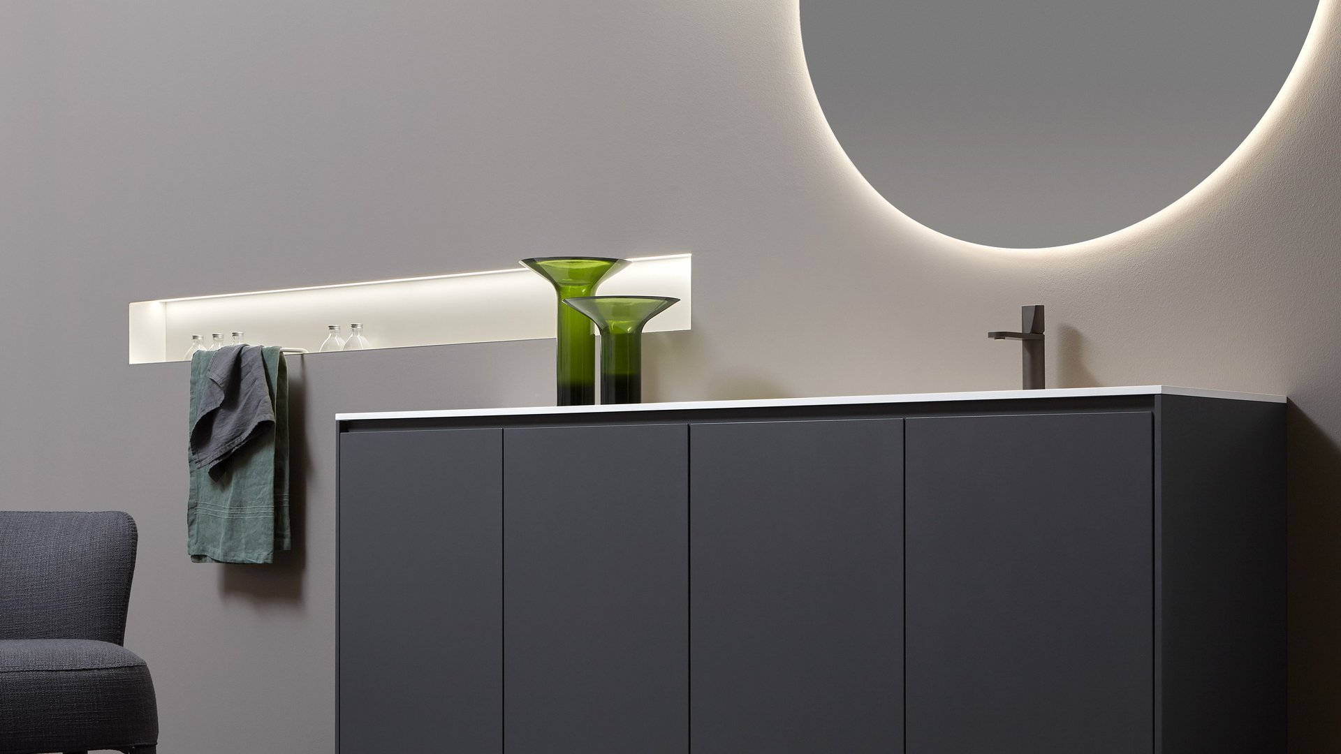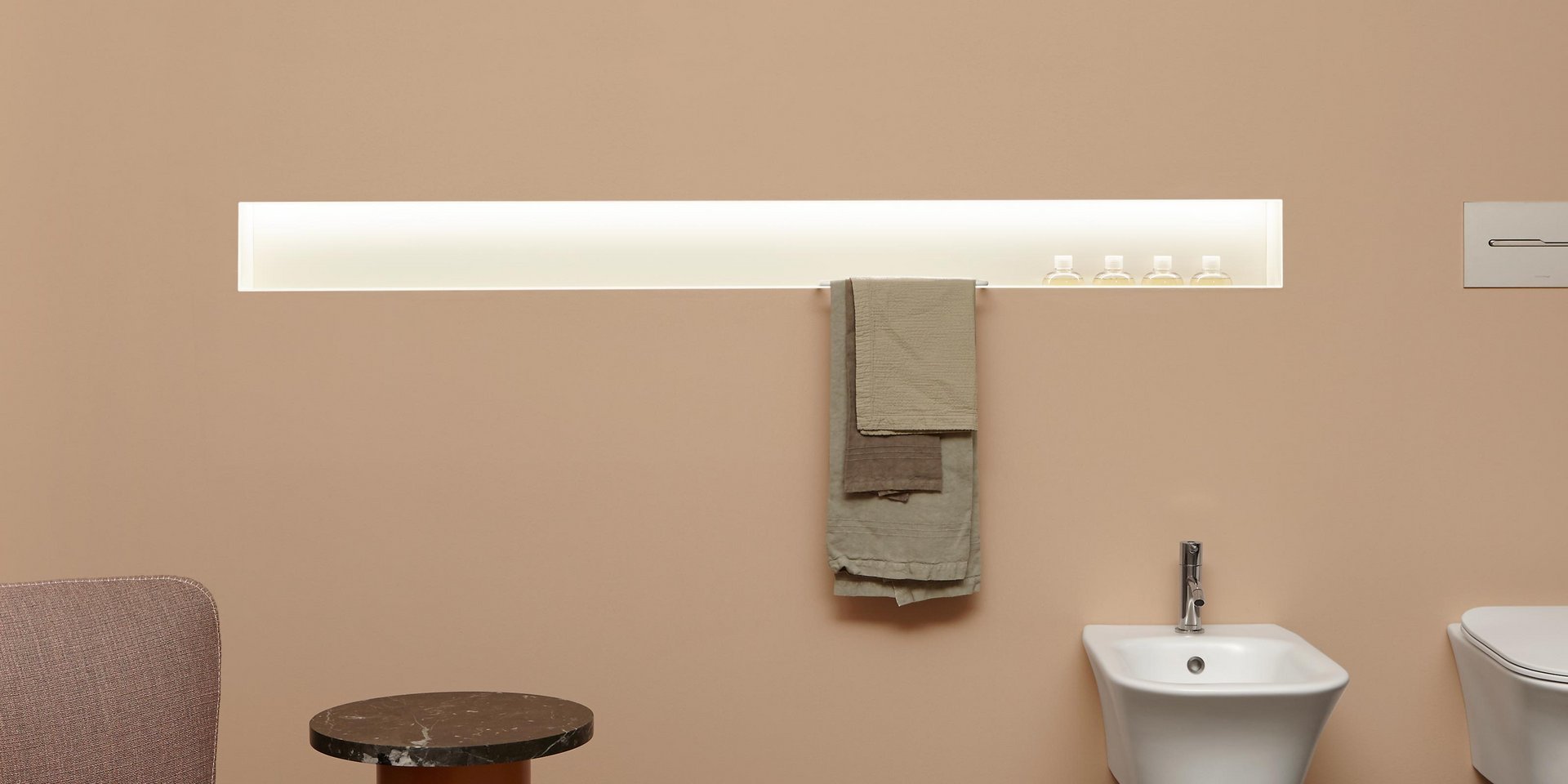 一个也可以照明的小型功能性壁龛,一个用于日常仪式的小型家庭舞台。涂漆金属棒和 Flumood 中的托盘放置在空间内,以满足您的需求。隔间可以具有与墙壁相同的颜色或以其他方式强调深度以获得更具戏剧性的效果。Ombra 特别配置为设计师在配饰的架构解析方面的有效帮助。该系统实际上具有定制功能:除了标准尺寸外,还可以定制长度。