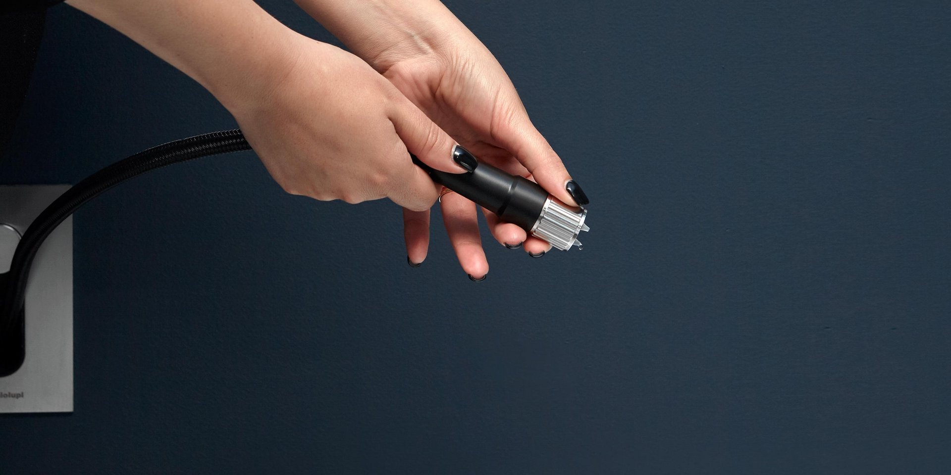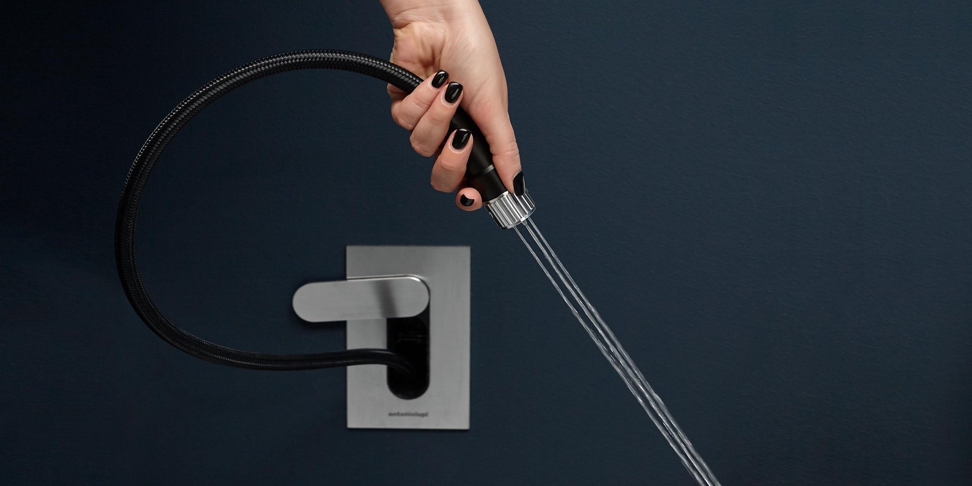 它的操作很简单:通过将板旋转 90°,同时打开水以及用柔性软管隐藏它的窗口。取出后只需转动头部即可打开喷嘴。再次旋转盘子,它会以一个手势、水和窗户关闭,然后“神奇地”消失在墙上,留下自由空间。