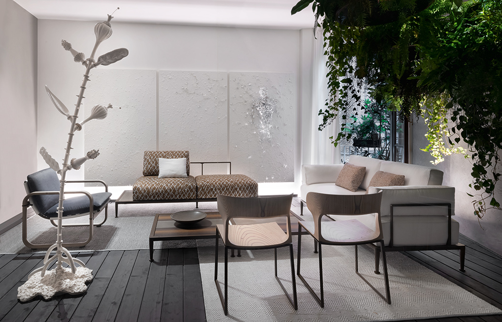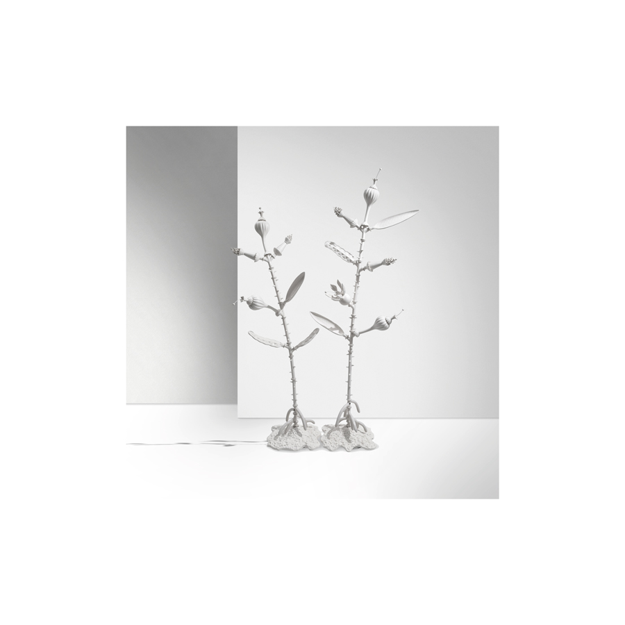 地板雕塑由白色釉面陶瓷模块和可调节的内部金属芯组成。可在两个不同的高度。亚马逊有一个陶瓷基地,其有机形状旨在允许多个茎的组合,以创建一个国内森林。