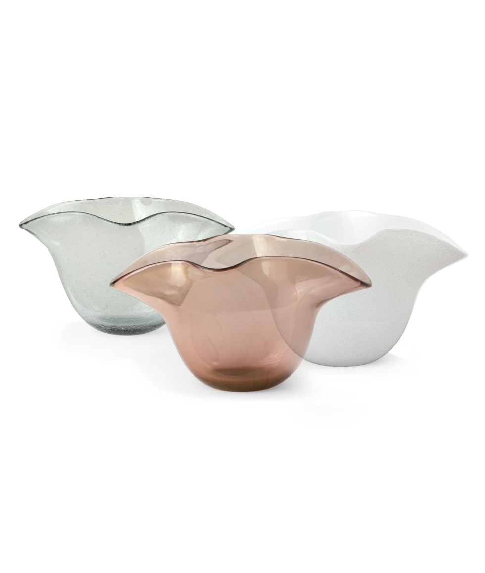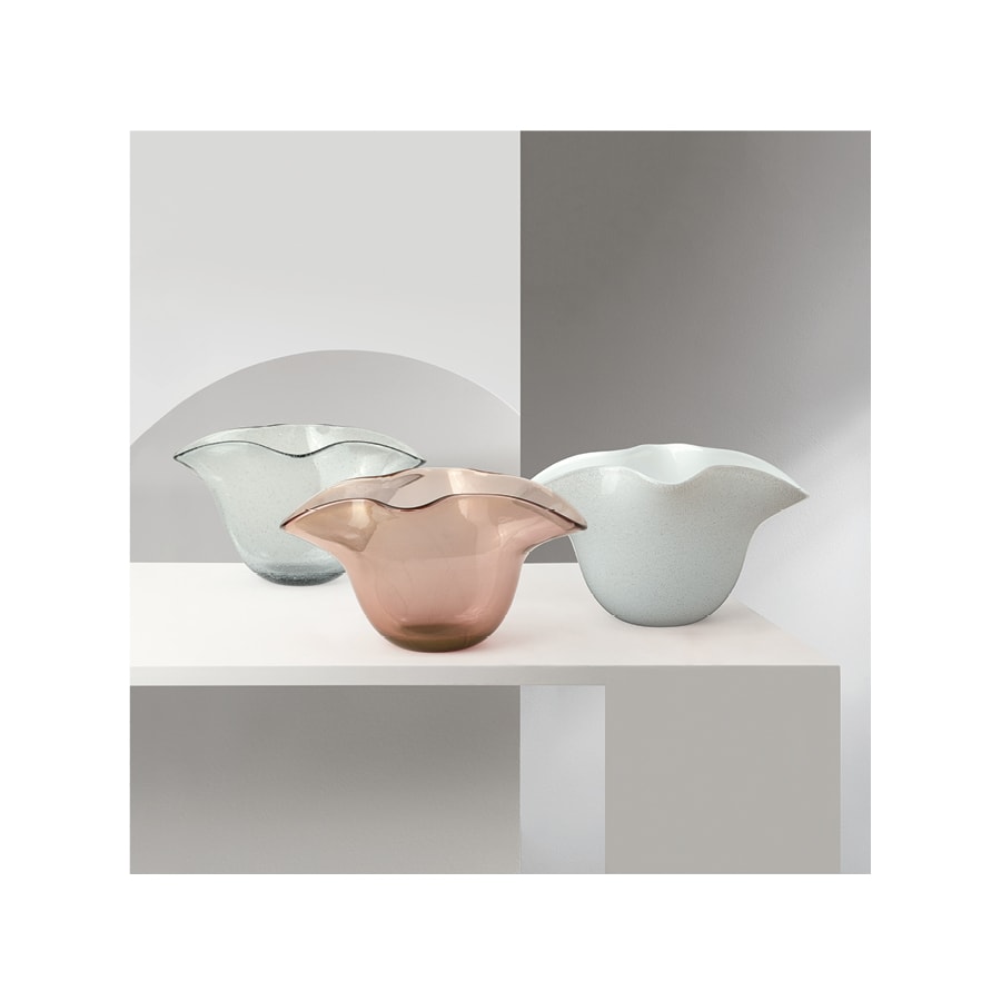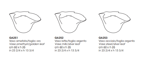 带有传统威尼斯装饰的模具吹玻璃花瓶,用金色或银色的叶子实现,玻璃内有碎片。Atena 是一个花瓶,形状不规则,有三种颜色可供选择:紫水晶/金叶、缎面牛奶/银叶和钢/银叶。