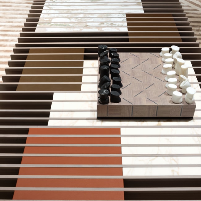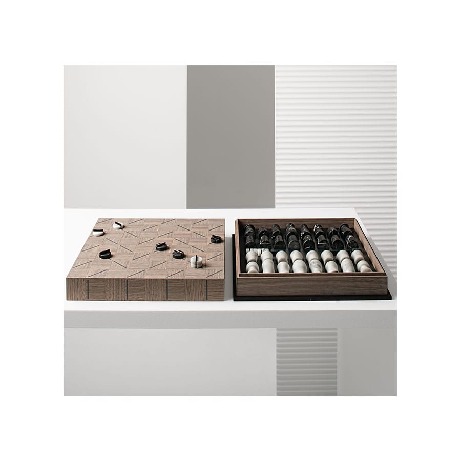 核桃卡纳莱托的棋盘与灰色完成和游戏件在金卡拉卡塔和黑色大理石。棋友不仅是棋盘经典黑白二元论新版本的艺术对象,也是小宝石的游戏作品,因为它们是有机的和不对称的形式。