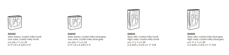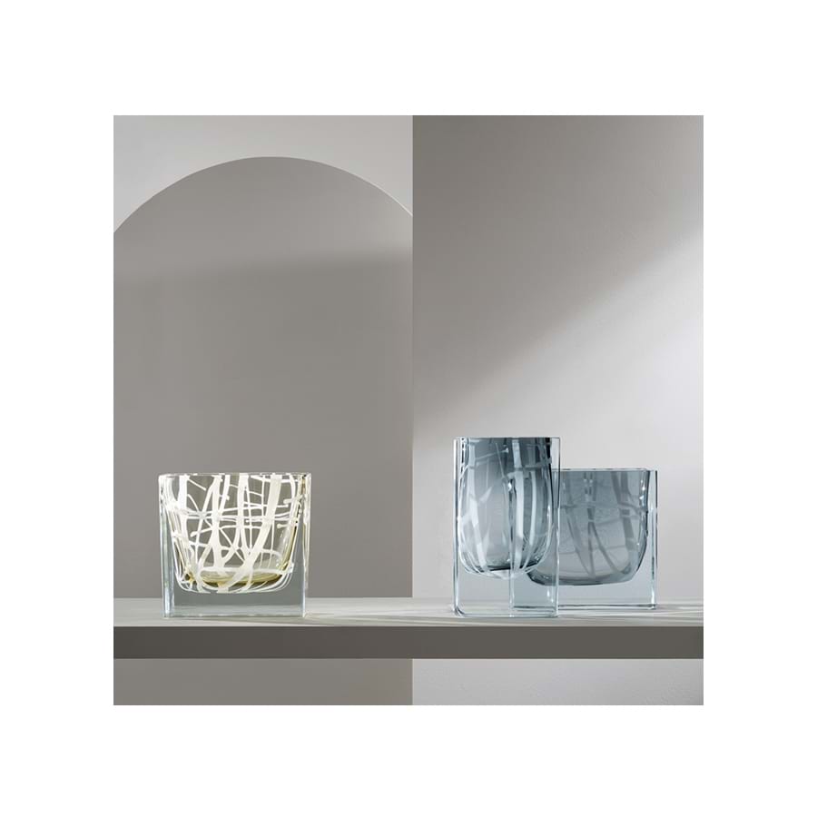 被吹成决定其几何形状的模具的花瓶。具有凹陷色实心玻璃的特点工作,用手工涂抹的白色玻璃线装饰。