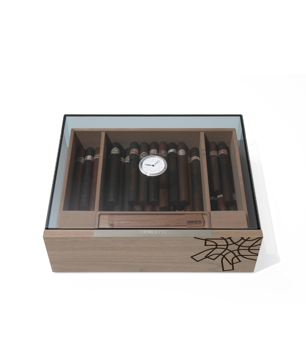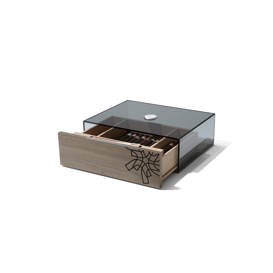 Club 是核桃木中的雪茄盒,再现了公司单字的镶嵌。雪茄盒在卡纳莱托核桃,雪松和烟熏玻璃