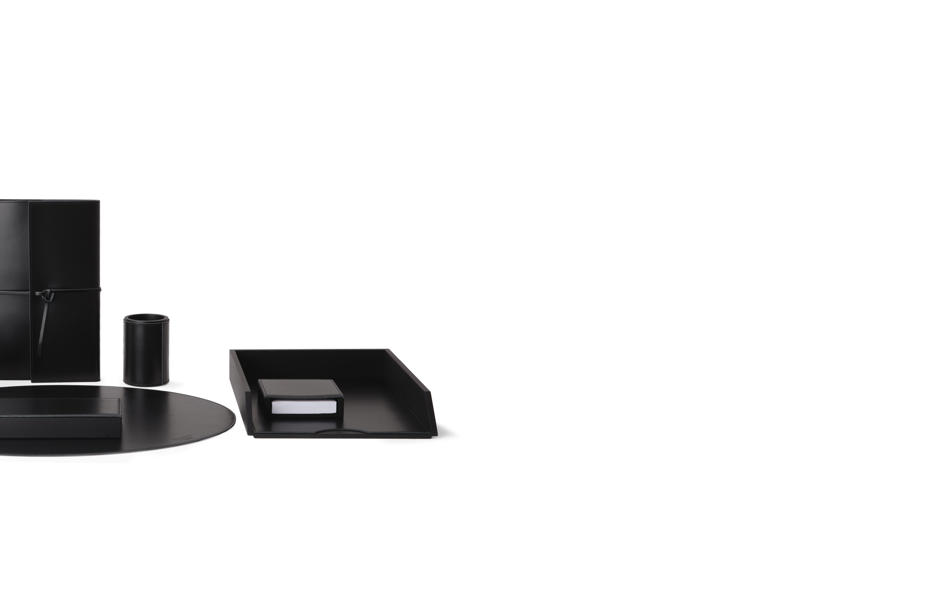 全桌组织者以皮革为三种颜色:米色、深棕色和黑色。这套包括书桌、铅笔杯、纸架、信盘、铅笔盒、盒子、笔记本。