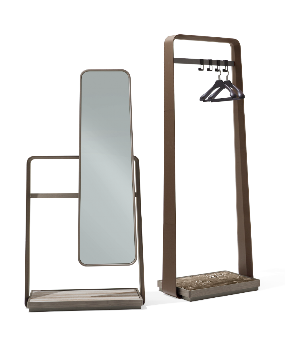 木材、鞍皮和大理石相结合,提供意想不到的触觉体验。代客站在鸽子灰色或石板灰色枫木和鞍皮革的横向轮廓。