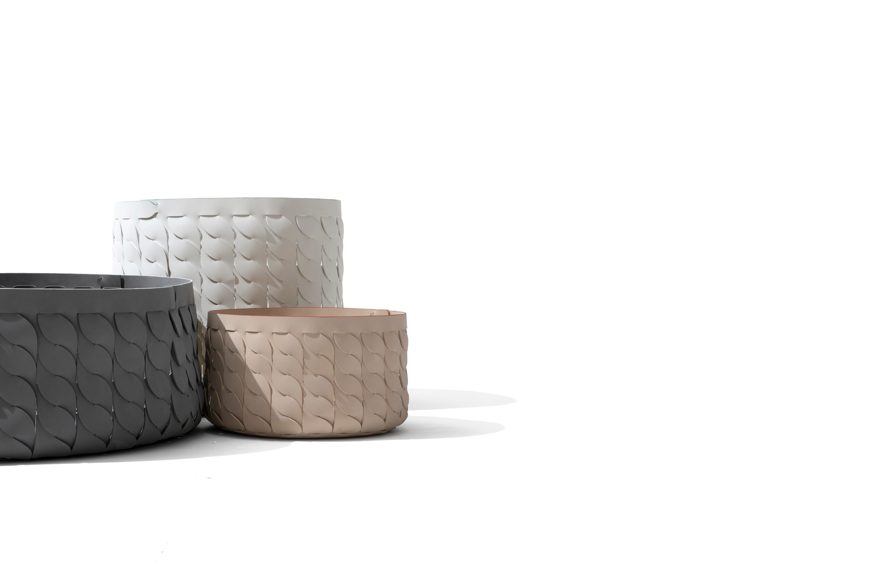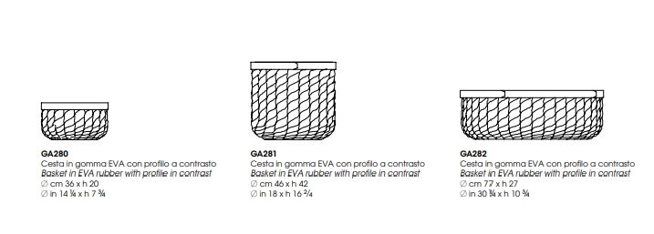 用EVA(一种驱水聚合物)制成的手编织篮。Koi 呈现了一个表面,其特点是特殊的编织,绘制弯曲的线条,灵感来自日本锦鲤的鳞片,这使得它成为一个复杂和有特色的配件。