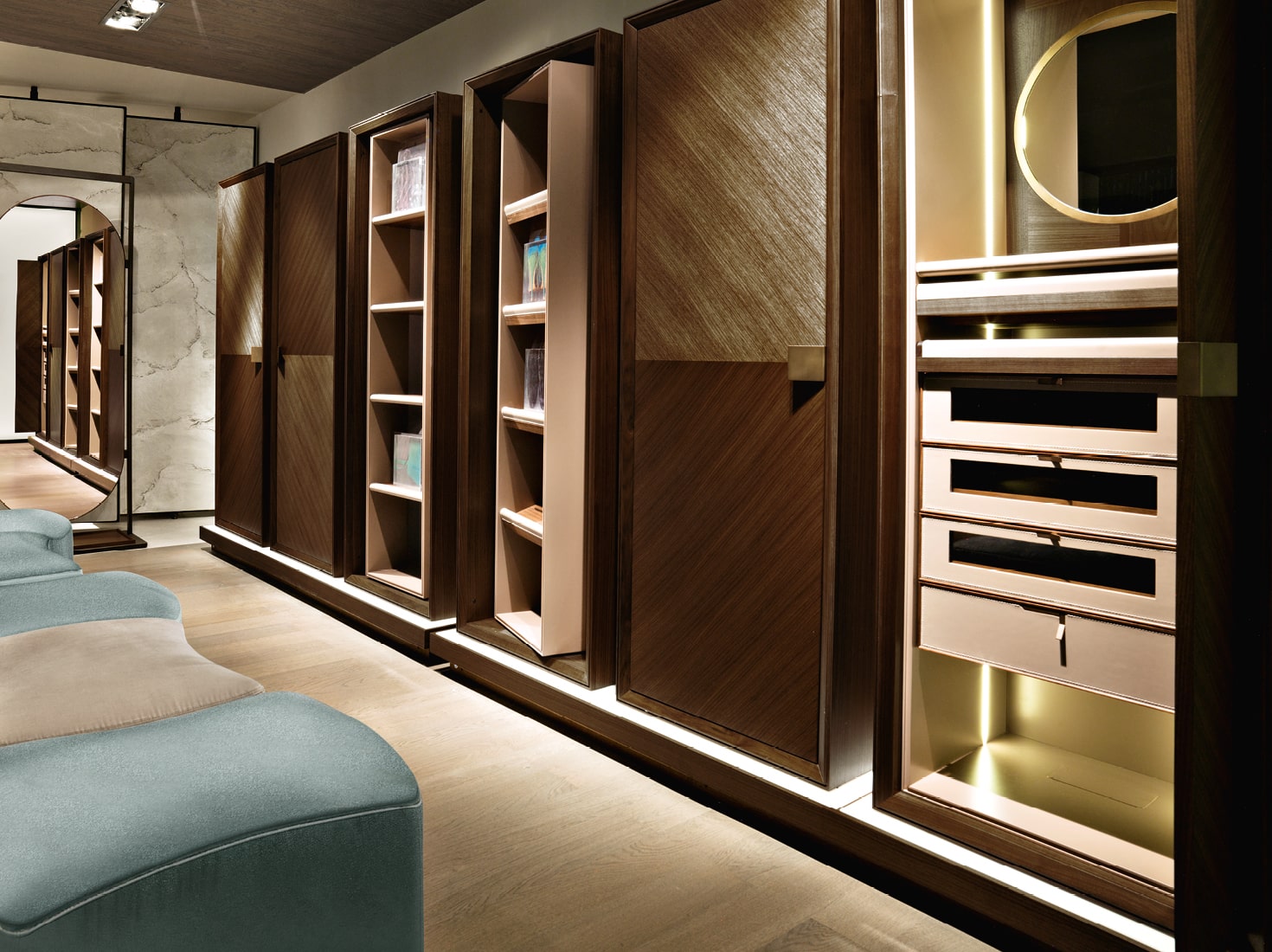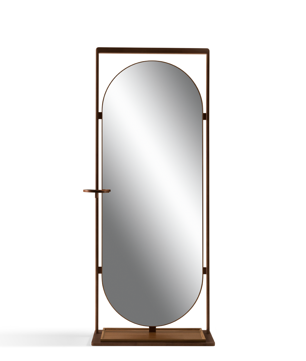 纳西塞为稍微匿名的空间增添了一丝设计色彩。核桃木的垂直镜子和涂有青铜色的金属。