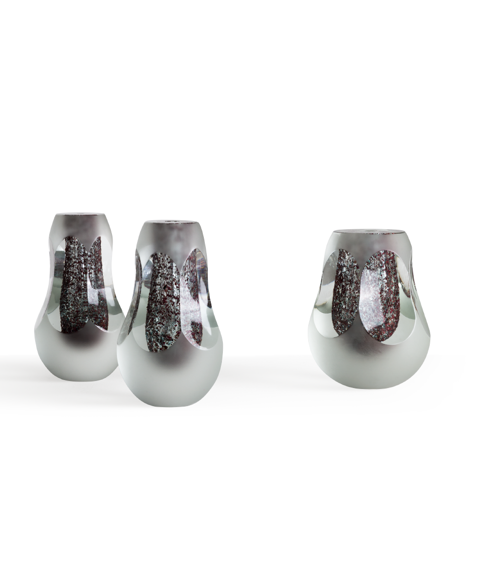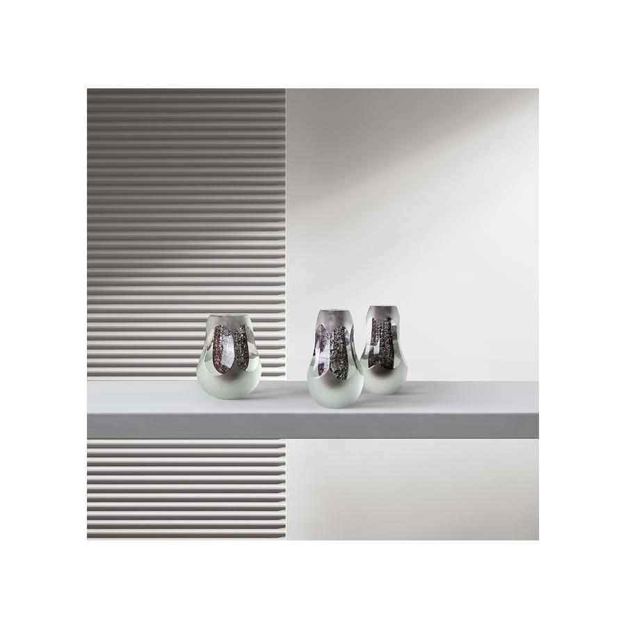 固体口吹花瓶,包括热处理黄铜的碎片。闪亮的表面是多面的,手工抛光。