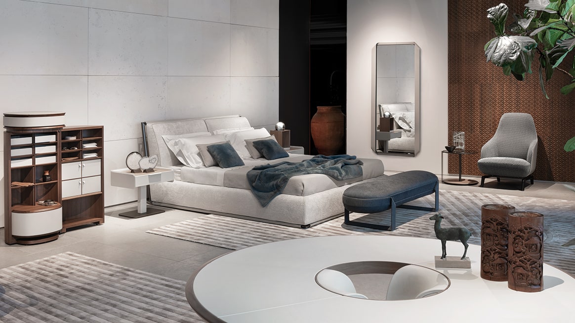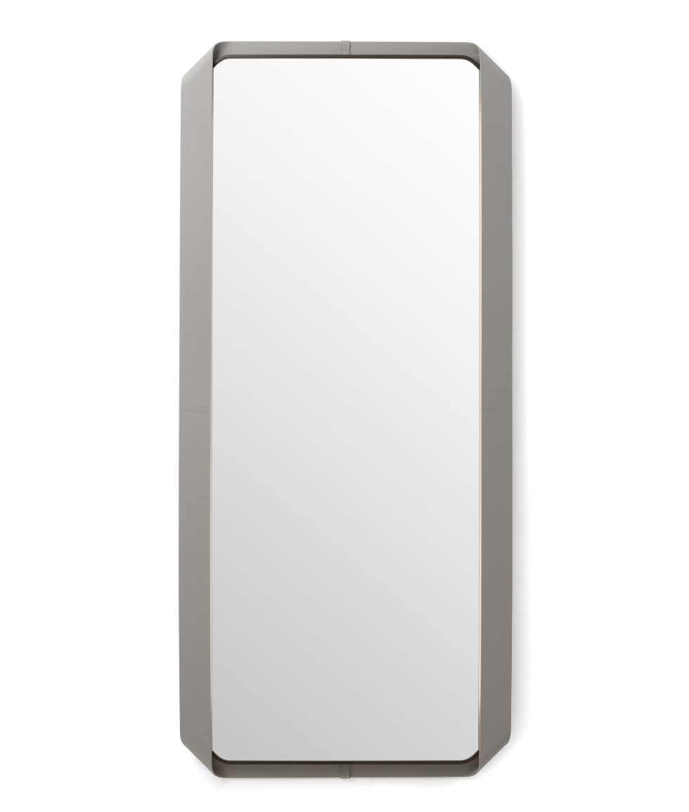 回想一条丝带的皮革框架沿着镜子运行,并定义其设计。超清晰镜面,钛液态金属效果,皮革框架漆轮廓