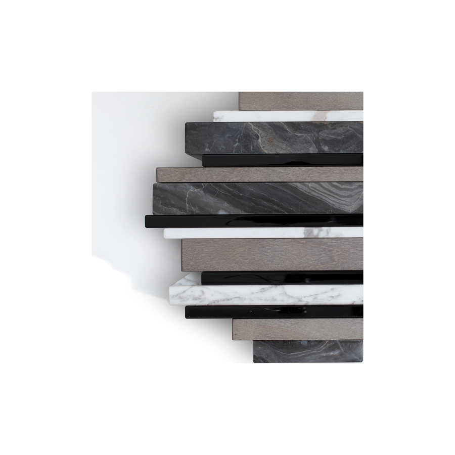 由不同厚度的不同材料制成的小型服务台。建筑概念变得装饰,因为有一个孔,跨越板,使其易于移动的实际目的的存在。
