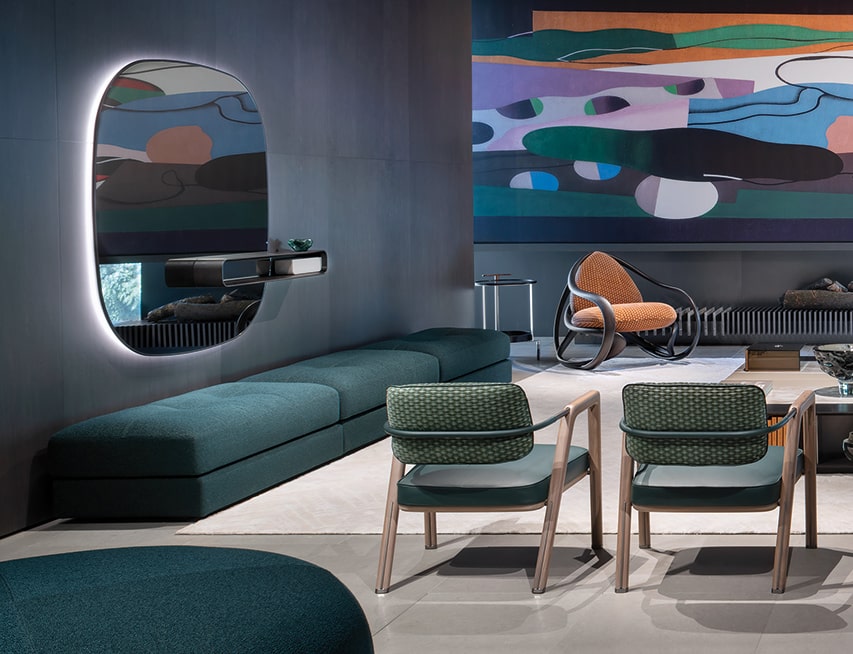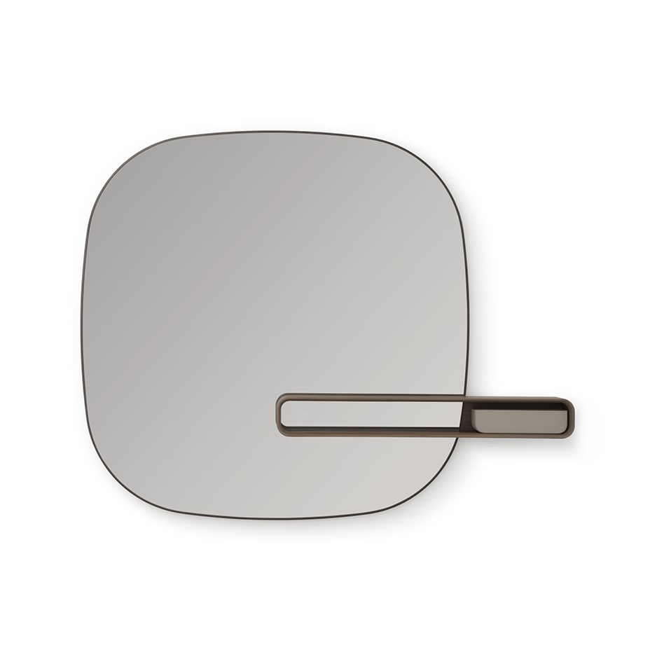有或没有照明的镜子。货架在卡纳莱托核桃,可以用皮革容器装饰。超清晰镜面,钛液态金属效果,皮革框架漆轮廓