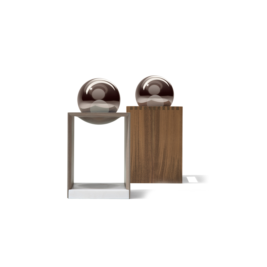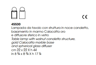 表灯的结构为天然或灰色卡纳莱托-努斯鲍姆,由金卡拉卡塔大理石的手指关节和底座的细节丰富。扩散器由双玻璃球组成:青铜反射色外球和白色釉面内部球。光强度是可调暗的。