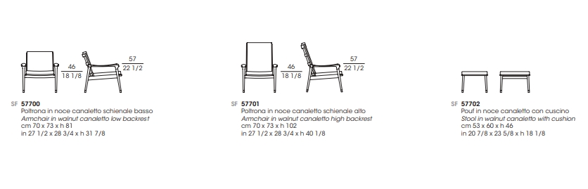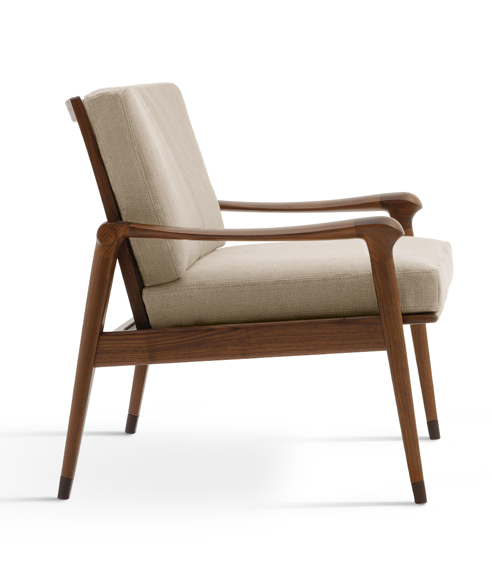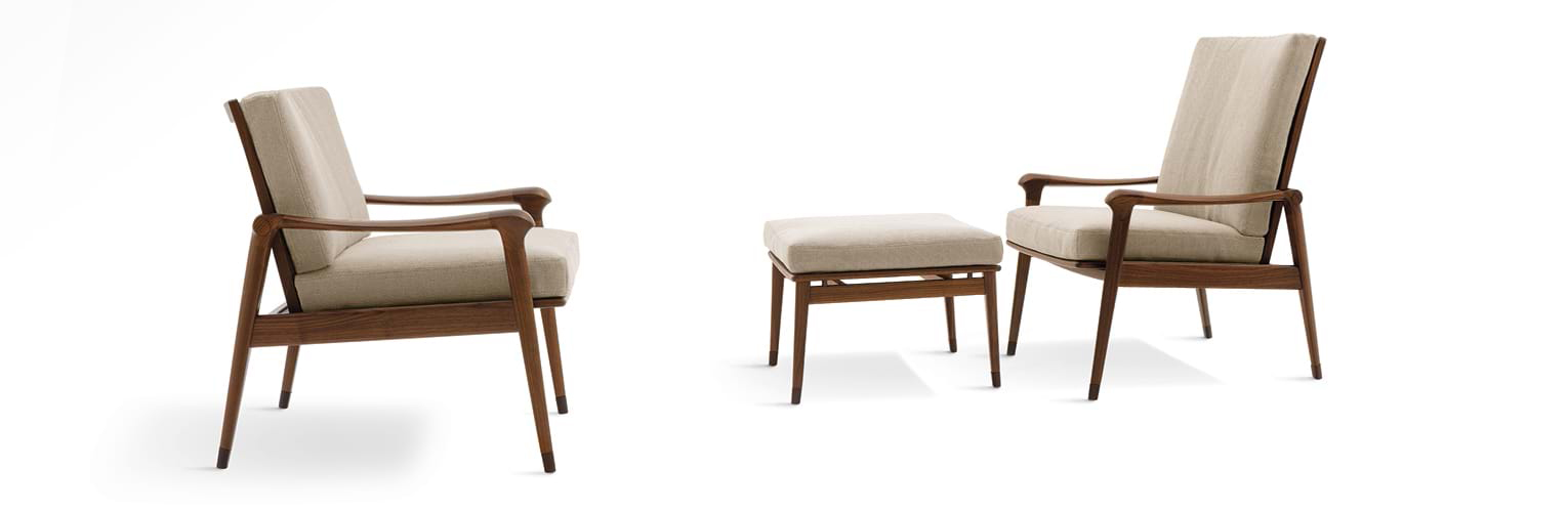 北欧的灵感,它的主要特点是极度舒适。扶手椅和波夫在固体核桃卡纳莱托木材与垫子覆盖在织物或皮革。