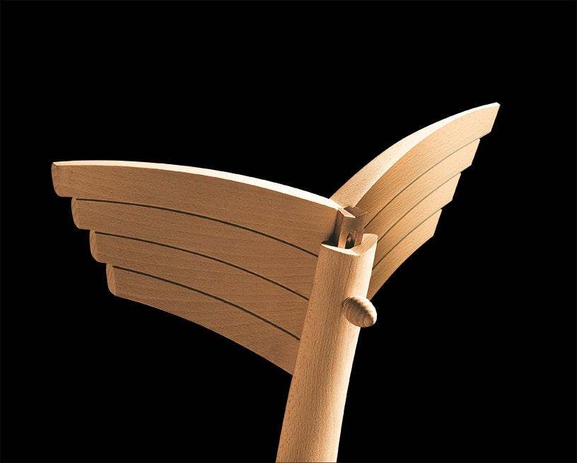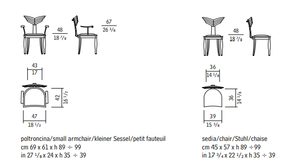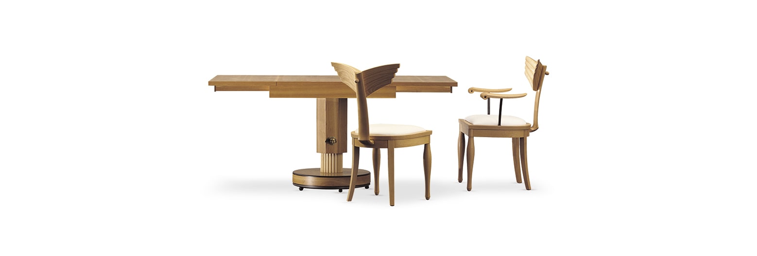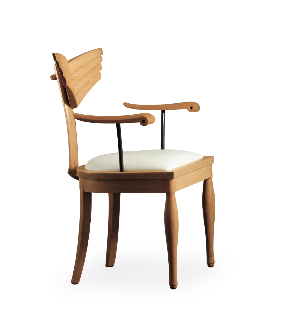 扶手椅和椅子在抛光固体山毛虫木材与可调的背部高度。椅子在抛光固体山毛虫木材与可调节的背部高度。座椅为不可变形聚氨酯。室内装潢有织物或皮革可供选择。