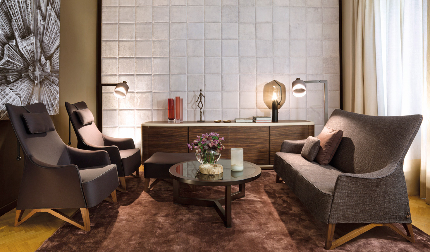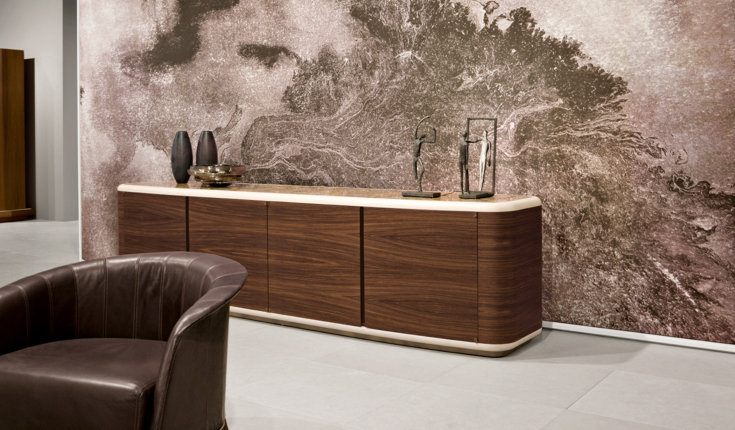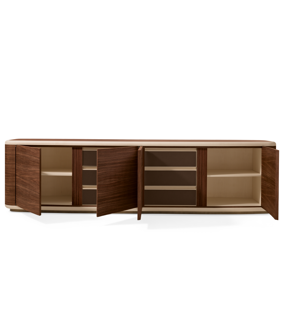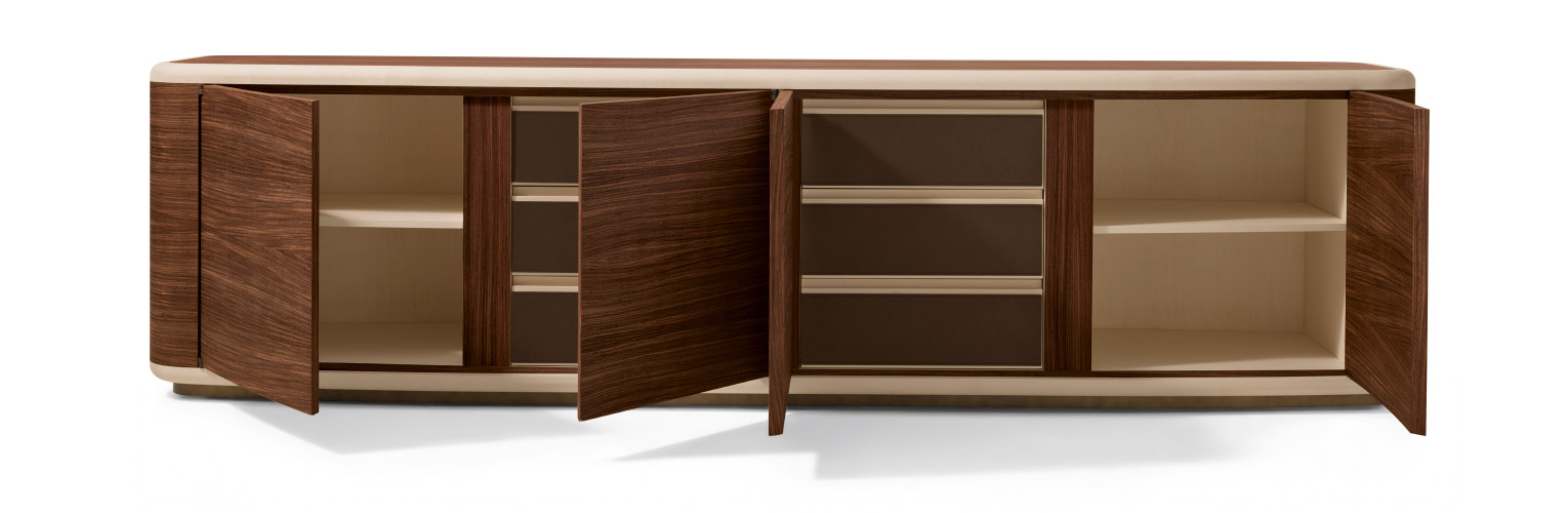 一个大柜子,由于流体图形标志变得动态和美观轻。柜子有四扇门在枫树和印度玫瑰木,内部隔间与LED灯。