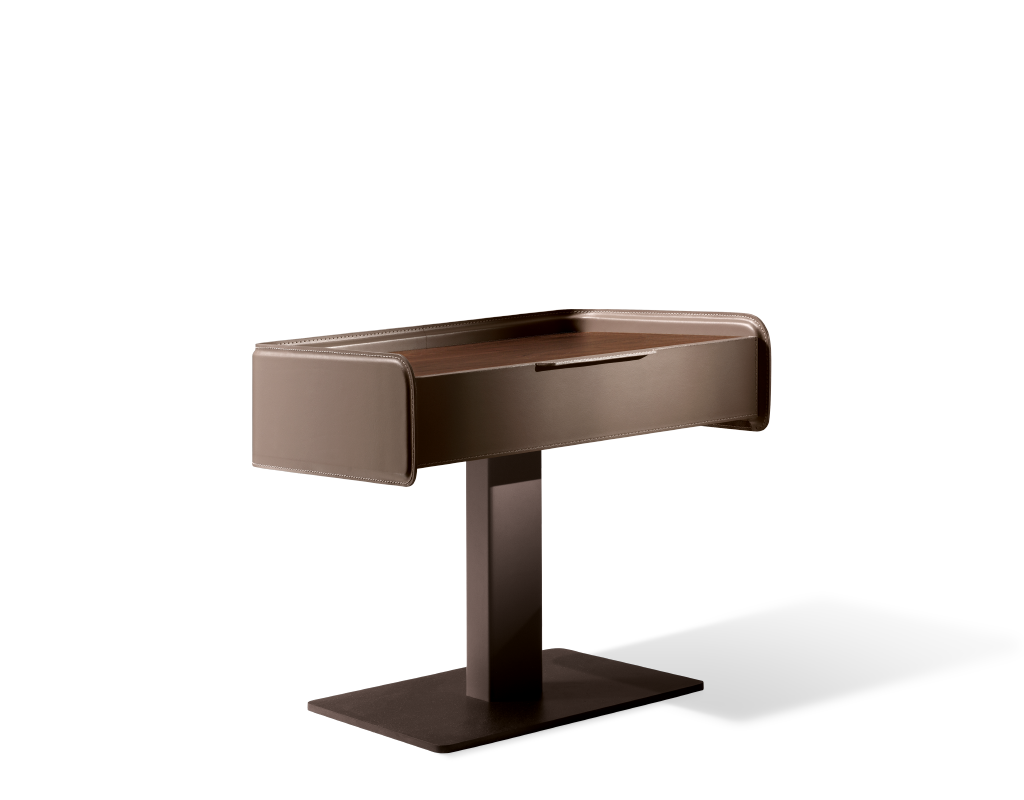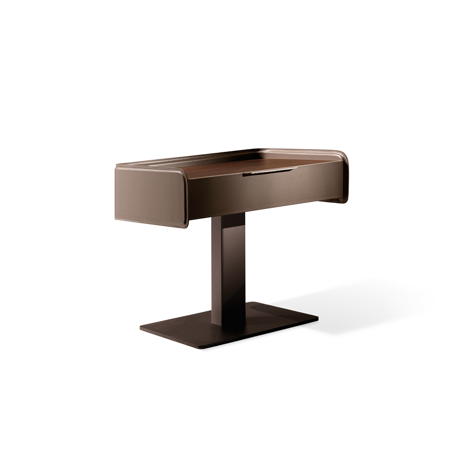带鞍皮覆盖物的原始床头柜。床头柜在鞍皮革,核桃卡纳莱托和金属基地。