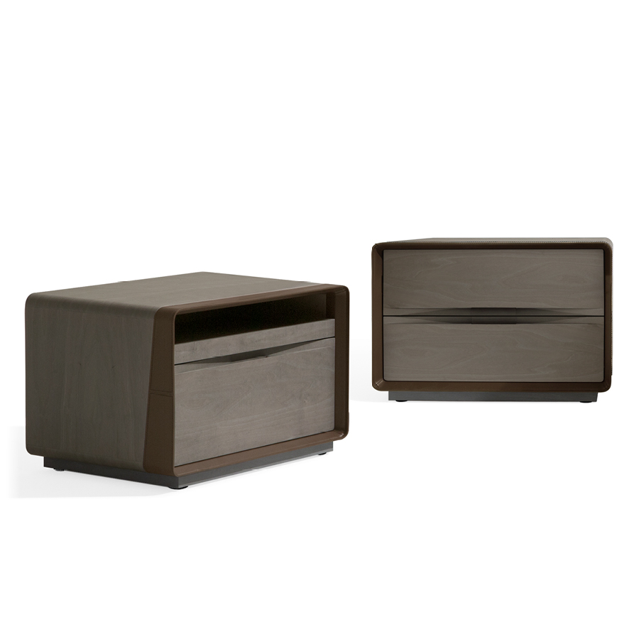 木材和鞍皮相结合,提供意想不到的触觉体验。床边柜在鸽子灰色或石板灰色枫木和鞍皮革的横向轮廓。