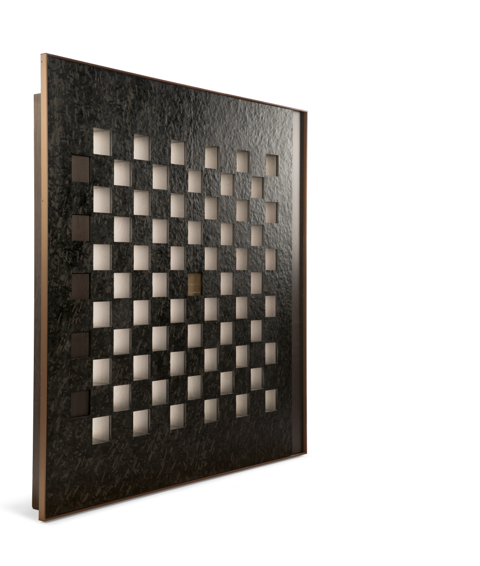 一件带有诗意灵魂的作品,将乔盖蒂的历史保存在其中,它提醒人们一个由120个隔间组成的珍贵展示柜,在枫木的光和暗饰之间交替平衡,象征着现在、过去和未来之间的持续对话。 枫木墙雕塑柜和碳门。它由 120 个隔间组成,并背光与 LED 配合,其光线可以调节。