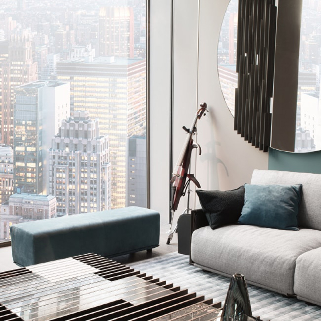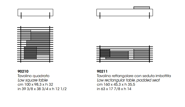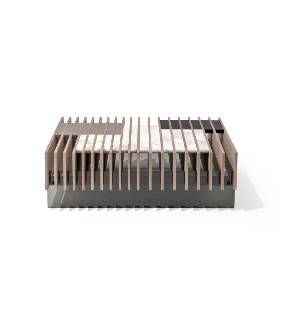 适合呈现核桃卡纳莱托木材定期重复条。由于大理石、皮革或金属插件,光学效果让人联想到 20 世纪 60 年代的图形。方形低桌和长方形低桌凳在核桃卡纳莱托木材与插入不同的材料:底座在灰色玻璃中。