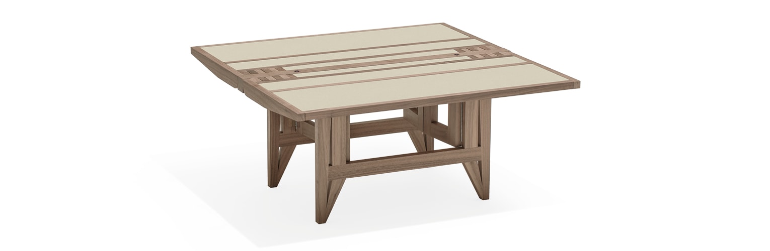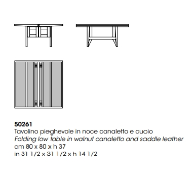 折叠式低矮的桌子,让人想起家具能够在任何地方重现家庭舒适感的想法。折叠低桌实心核桃卡纳莱托木材和插入鞍皮革。