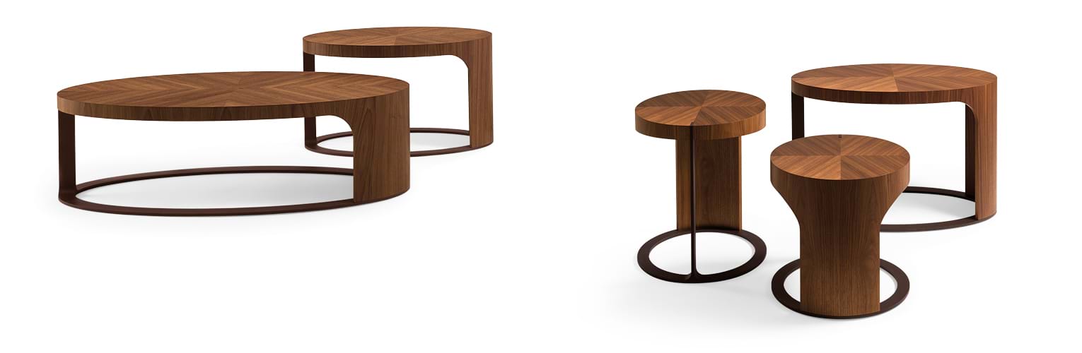 凌,在中国灵活,移动,是一个多功能的对象,其中木材和金属结合的风格和技能。圆形和椭圆形的咖啡桌,用核桃罐头木和金属漆成青铜色。