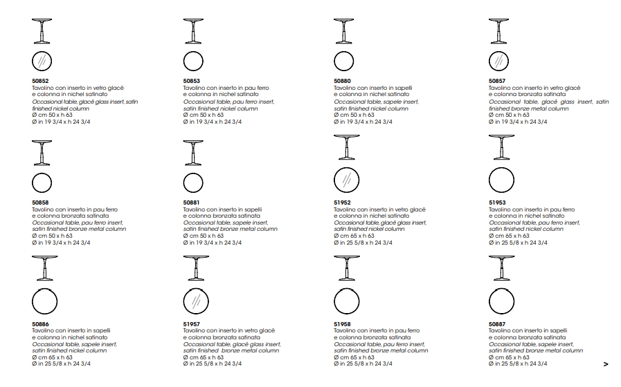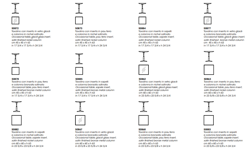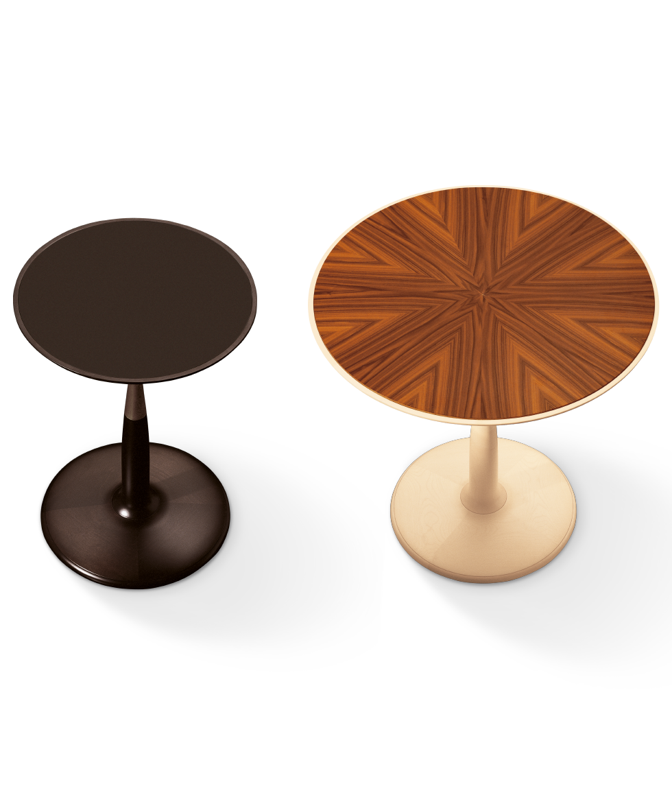顶部是奥蒂小桌子无可争议的主角:在pau铁罗版中,复仇者自然设计了一个几乎几何图案。枫树中的圆形和方形咖啡桌和缎子中的柱子制成镍或青铜金属。顶部的插入物有玻璃、波铁或萨佩尔红木。