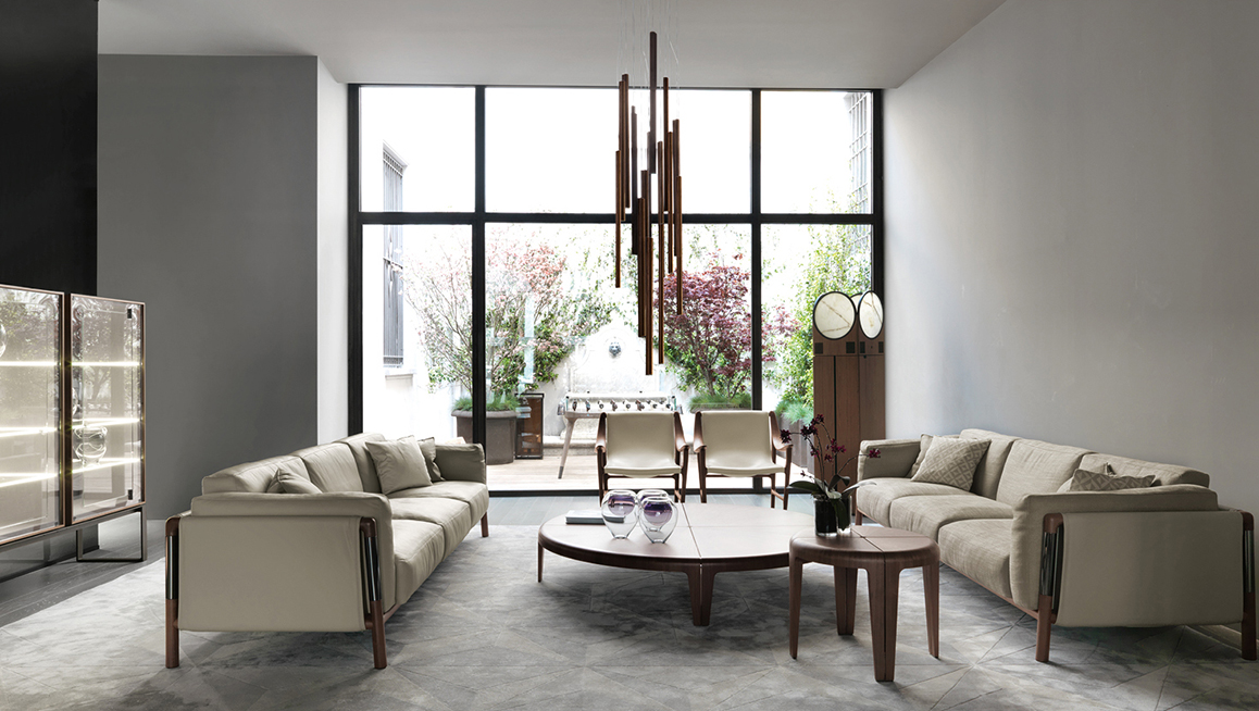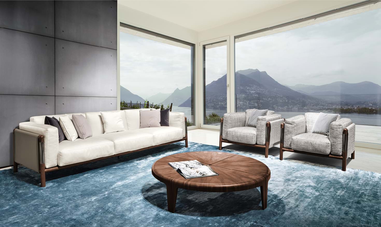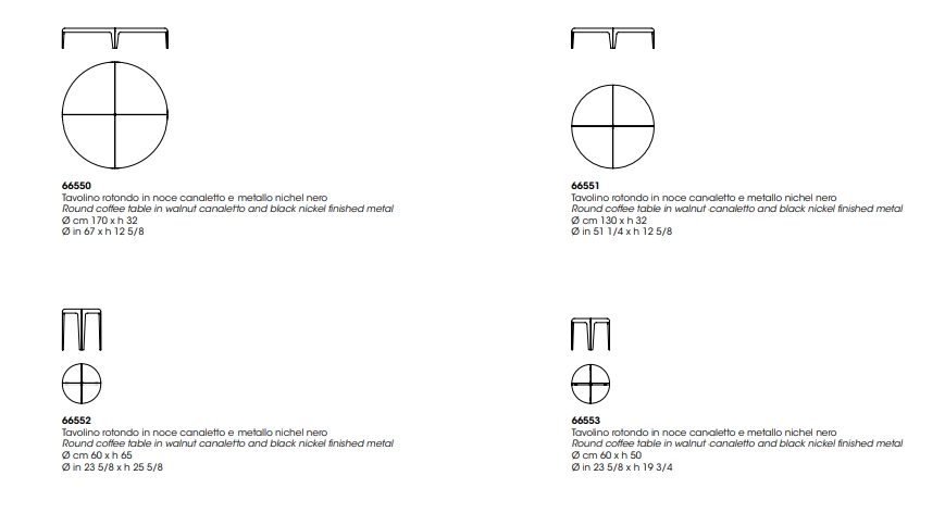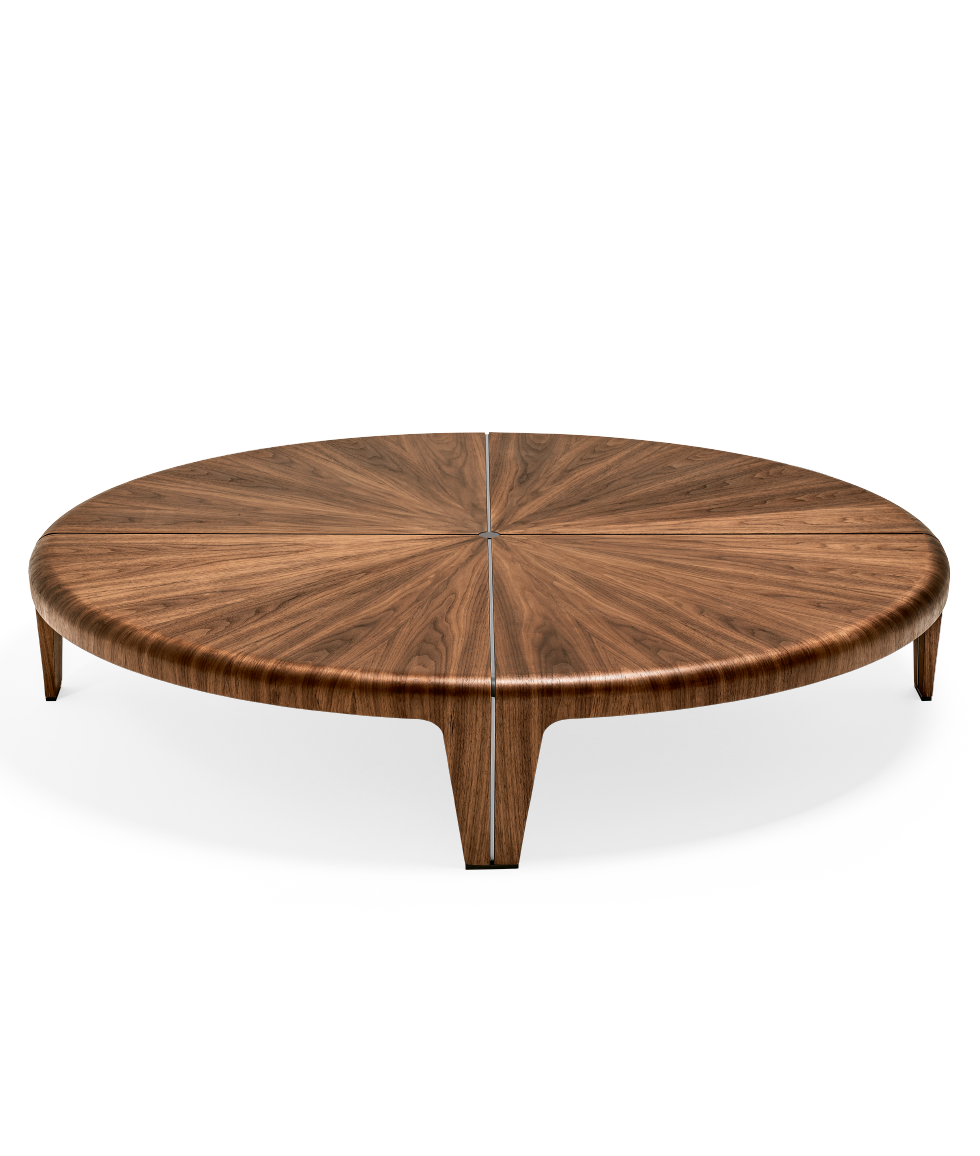 几何形状的完美借给圆咖啡桌,柔软和圆线。圆形低桌在核桃卡纳莱托木材和插入黑色镍成品金属。