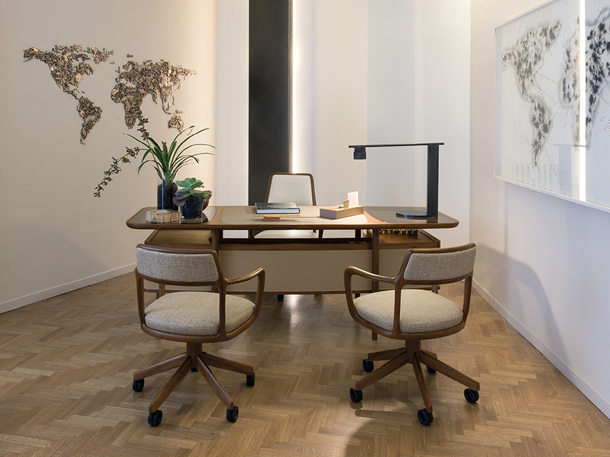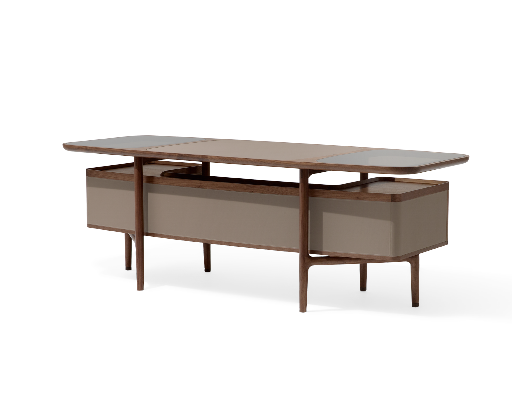 一块在办公室或家里的位置,像建筑的缩影。写字台用核桃木和皮革,用皮革或青铜或灰色水晶玻璃的横向插入顶部。