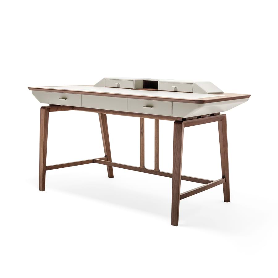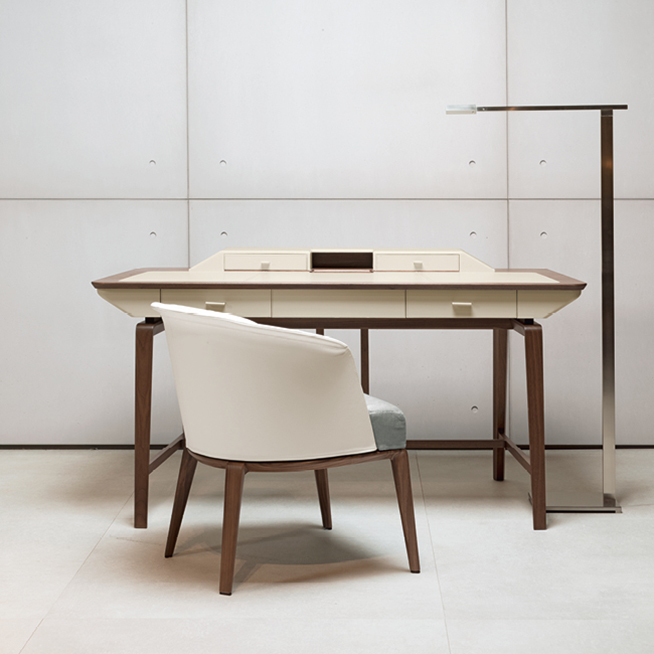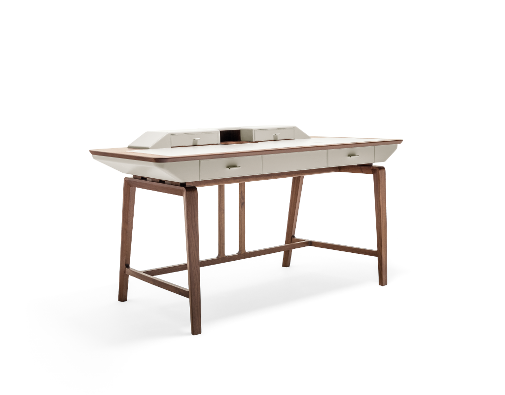 极简主义的线条设计了Studium办公桌,将核桃木与马鞍皮革放在一起。发现版本写字台在核桃卡纳莱托木材和顶部,上部和抽屉的前两侧覆盖着鞍皮革。