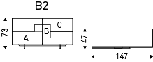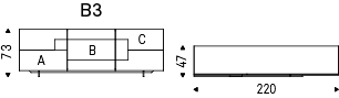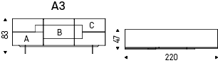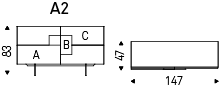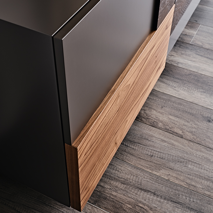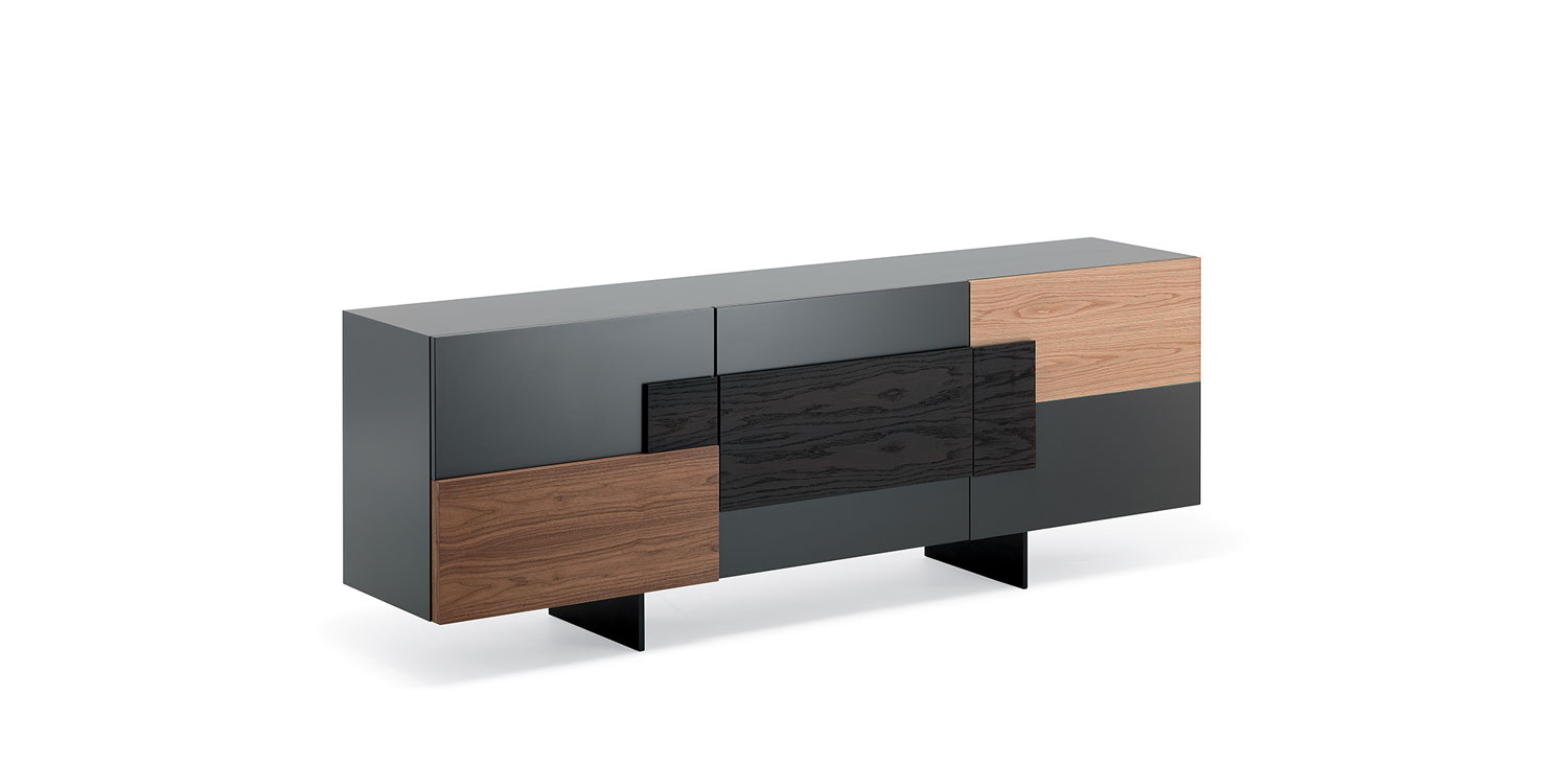哑光石墨 (OP69) 涂漆框架餐具柜。木质嵌件:A - 卡纳莱托胡桃木 (NC),B - 烧焦橡木 (RB) 和 C - 天然橡木 (RN)。压纹黑色喷漆钢脚 (GFM73)。内部透明玻璃搁板。可选:每个门的内部抽屉。