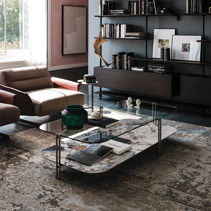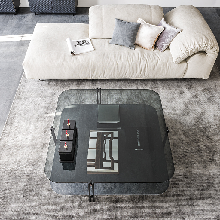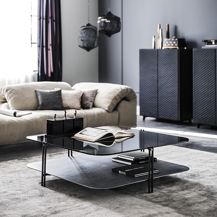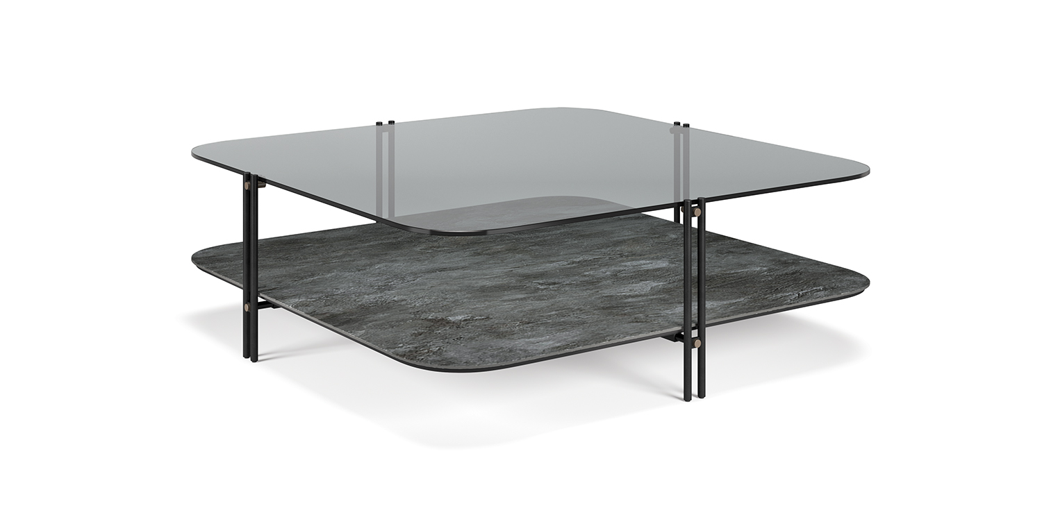 咖啡桌采用压纹钛 (GFM11) 或黑色 (GFM73) 喷漆钢结构。透明或烟熏玻璃上部顶部和 Marmi Ardesia (KM04)、Emperador (KM10)、Makalu (KM11)、Breccia (KM12) 或 Arenal (KM13) 陶瓷下部顶部。黄铜细节。