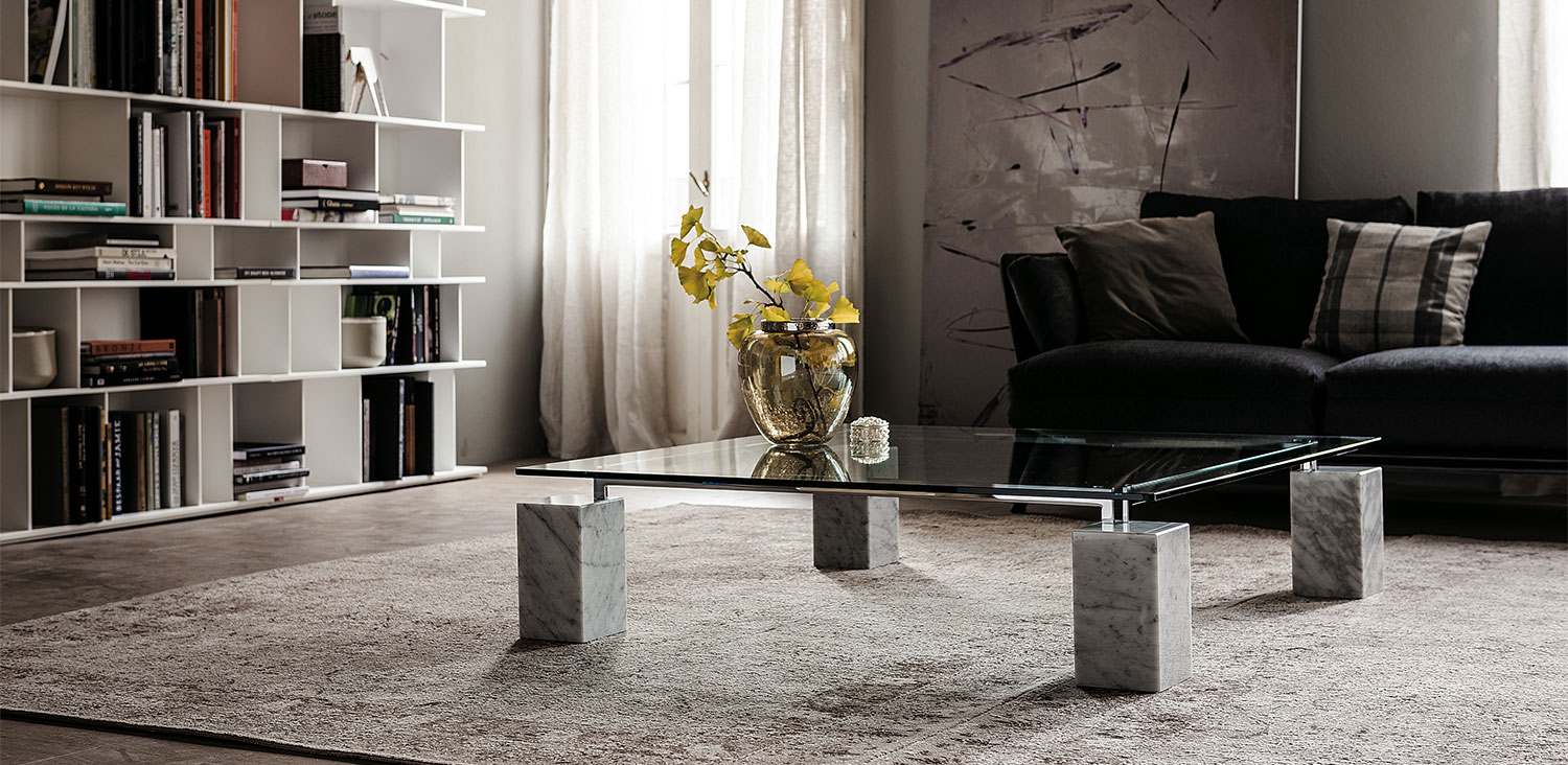 咖啡桌底座采用白色 Carrara (BC) 或黑色 Marquina (NM) 大理石制成。镀铬 (08) 或黑色 (OP17) 金属条。透明玻璃顶。