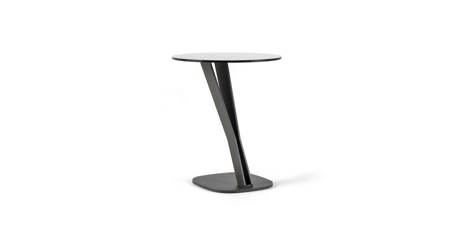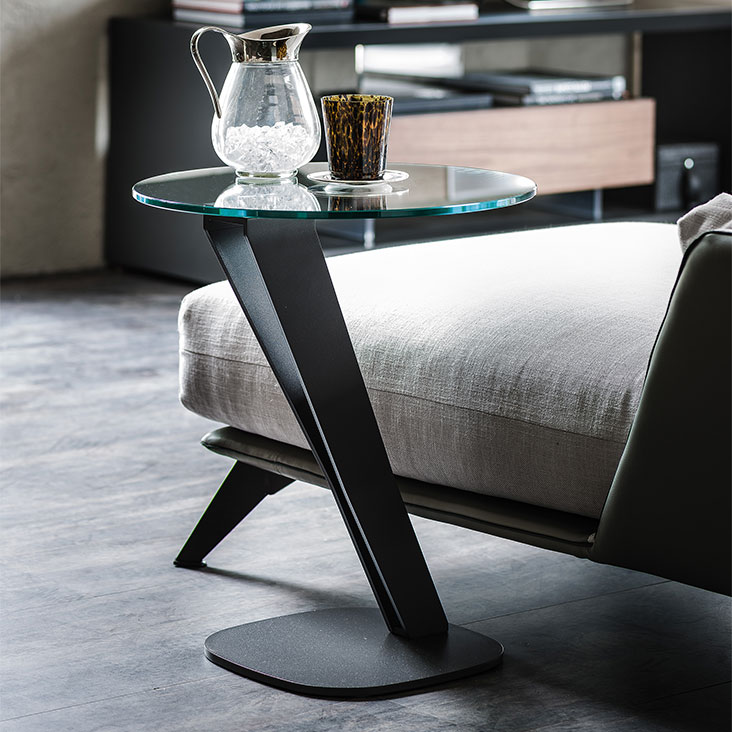 沙发边桌采用石墨 (GFM69) 压纹漆钢底座。透明或烟熏玻璃顶部。