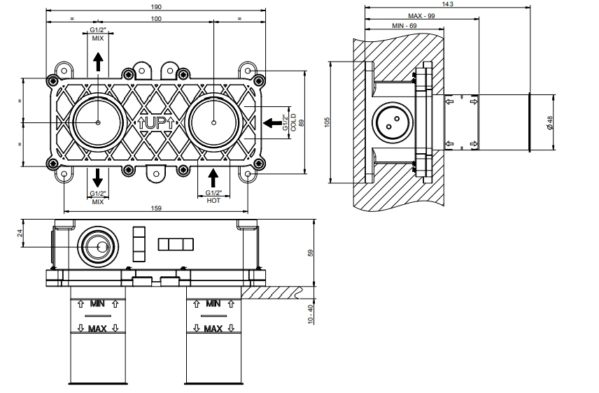 内置部分用于壁挂式淋浴搅拌机,双向。
