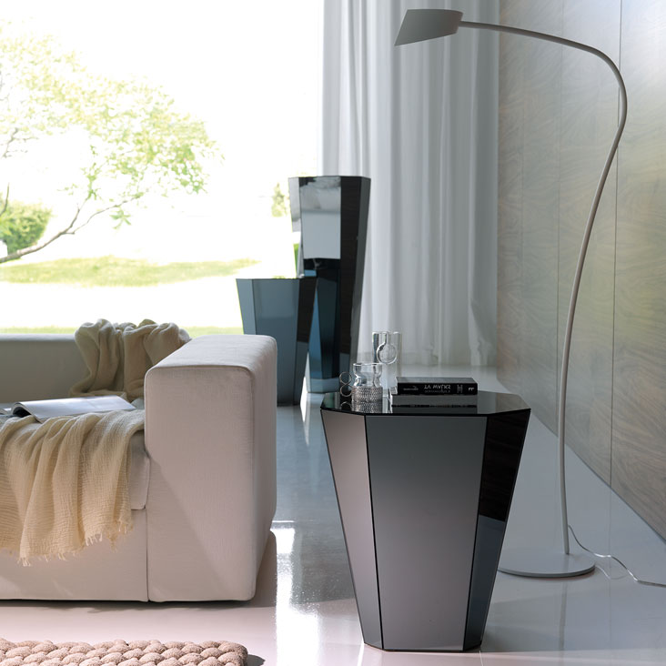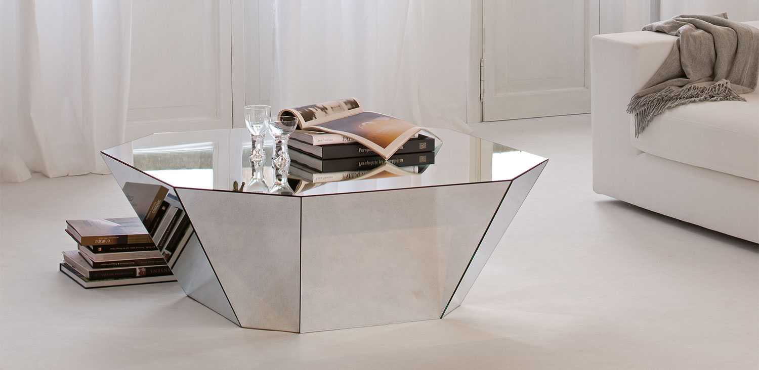 咖啡桌完全覆盖着镜面玻璃或烟灰色镜面玻璃。