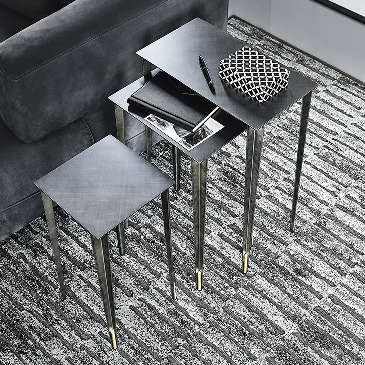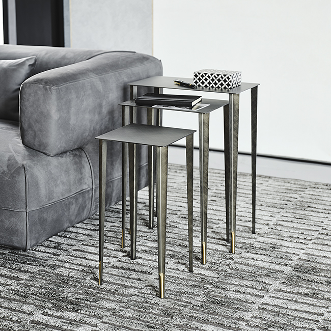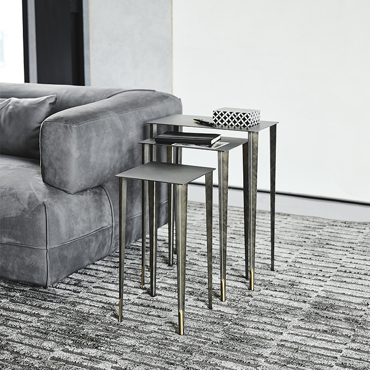 咖啡桌采用拉丝黄铜、拉丝青铜或拉丝灰色漆钢和黄铜细节结构。