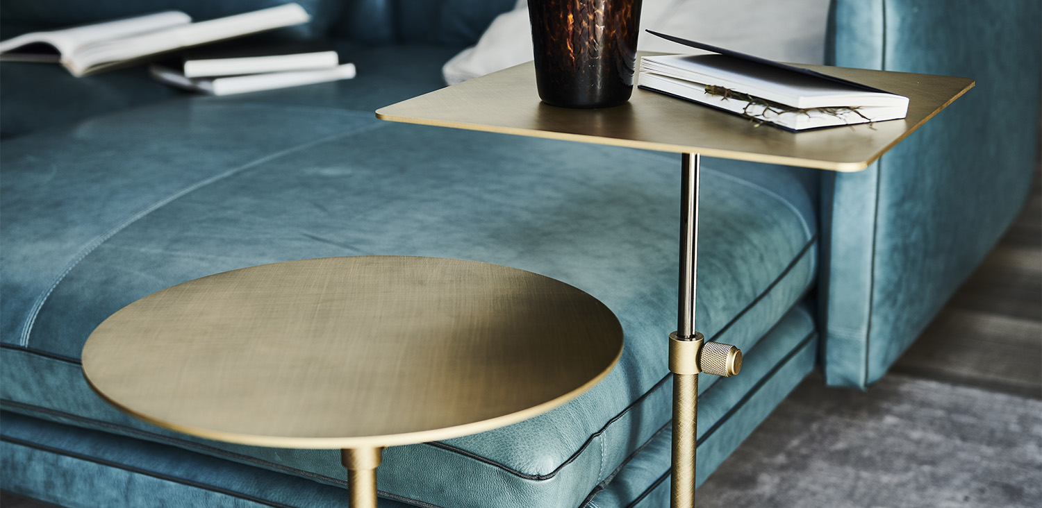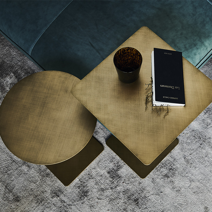 可调节咖啡桌,底座、桌腿和桌面采用钛 (GFM11) 或黑色 (GFM73) 压纹漆钢、拉丝黄铜或拉丝灰色。黑色铬 (06) 钢阀杆。