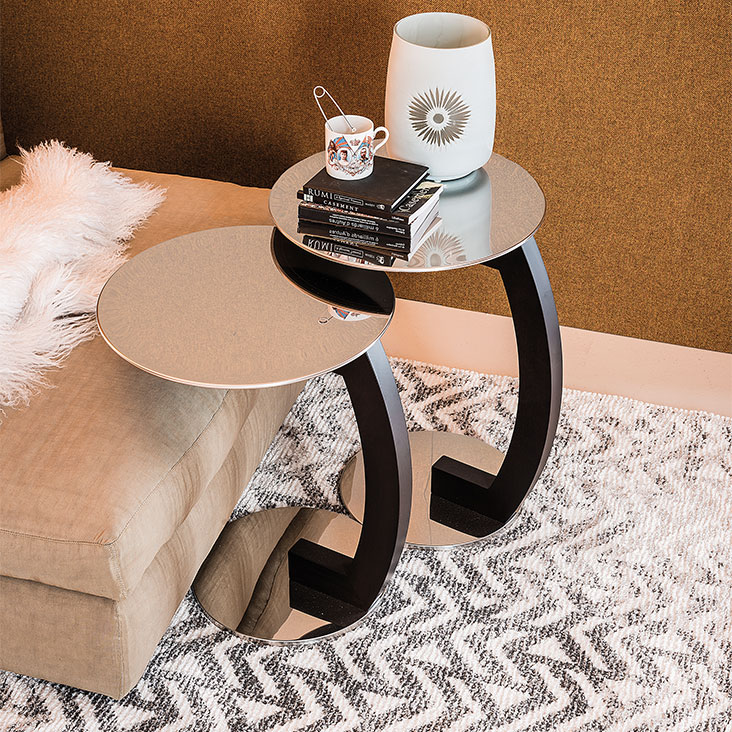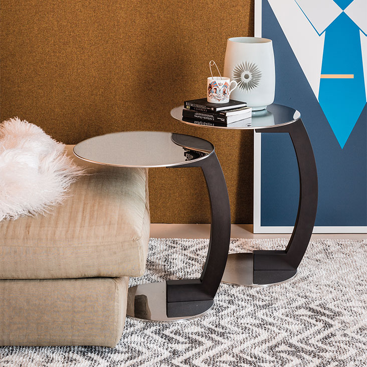 边桌配有抛光不锈钢底座和 wenghè (FW) 染色实心山毛榉木腿。顶部采用抛光不锈钢或透明玻璃。
