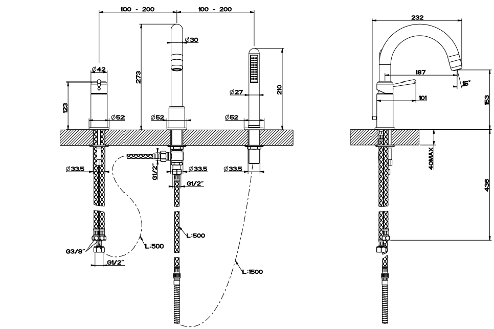 ‎三孔浴缸搅拌机与分流器在喷口,1,50米柔性软管和防石灰石手淋浴‎