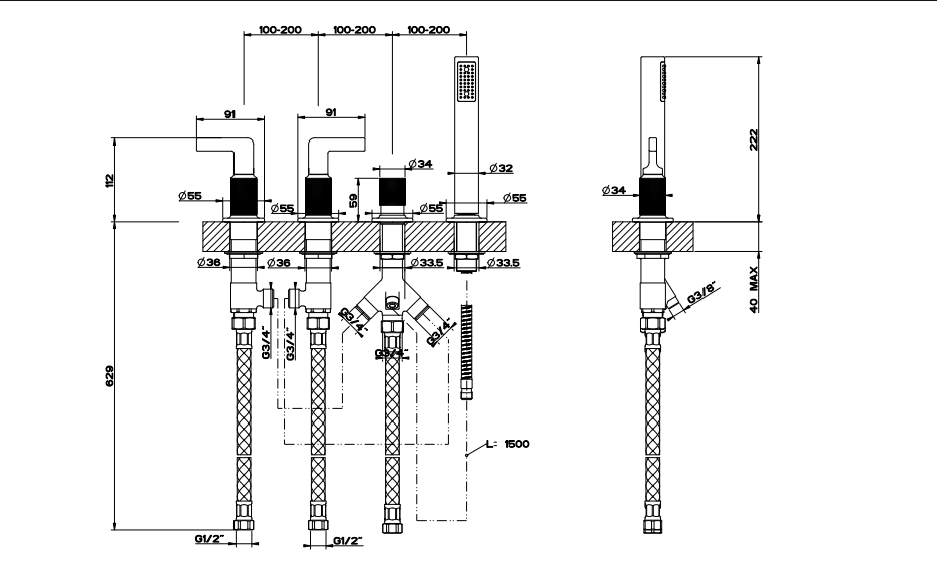 四孔浴缸搅拌机,分流器,1,50 mflex软管和拉出手淋浴。用于溢流填充物