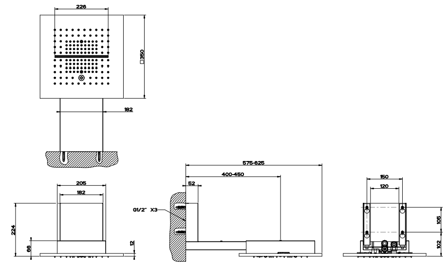 350X350 多功能系统,墙面固定版本。具有降雨/瀑布/雾功能