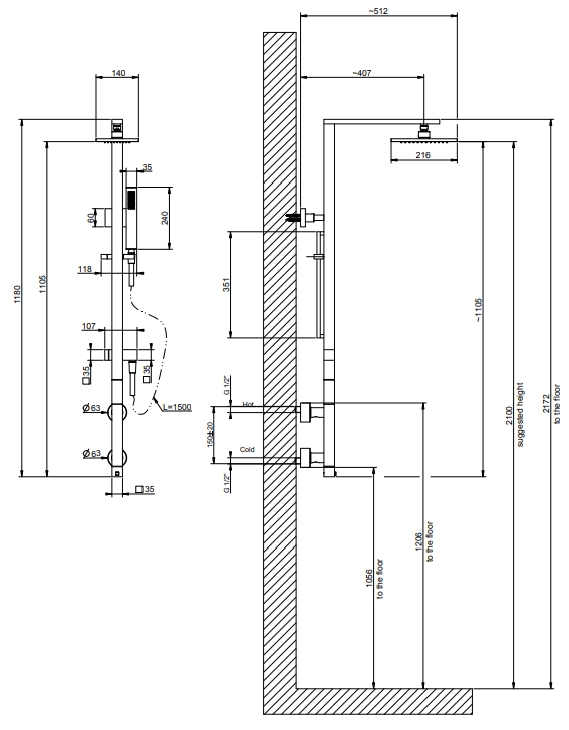 ‎壁挂式恒温搅拌机,配有 0 306 个淋浴喷头、自动浴缸/淋浴分流器、1,50 米柔性软管、滑轨和蚂蚁伊利梅斯通手淋浴机‎