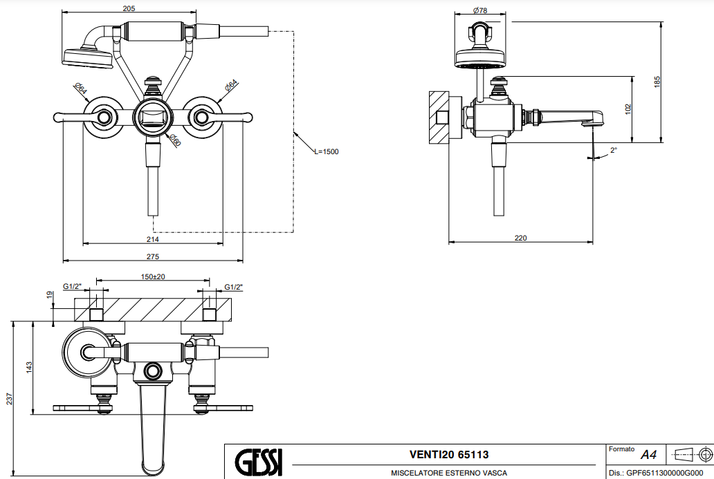 壁挂式沐浴搅拌机、浴缸/淋浴分流器、1,50 米柔性软管和带固定 h ook 的防石灰石手淋浴器的外部部件。