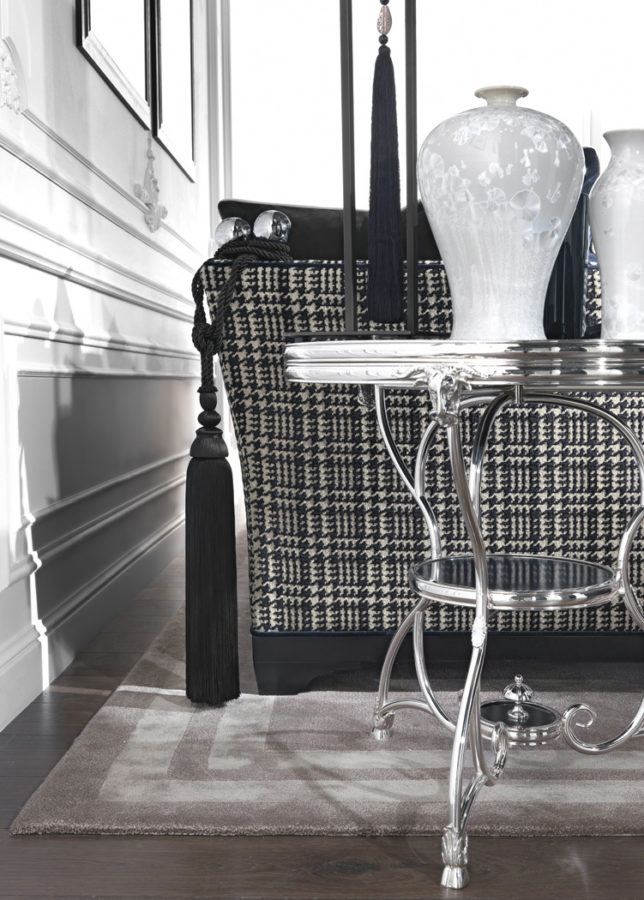 金属结构边桌。镀铬精加工。顶部和下部托盘采用多层杨木,采用黑漆表面处理。