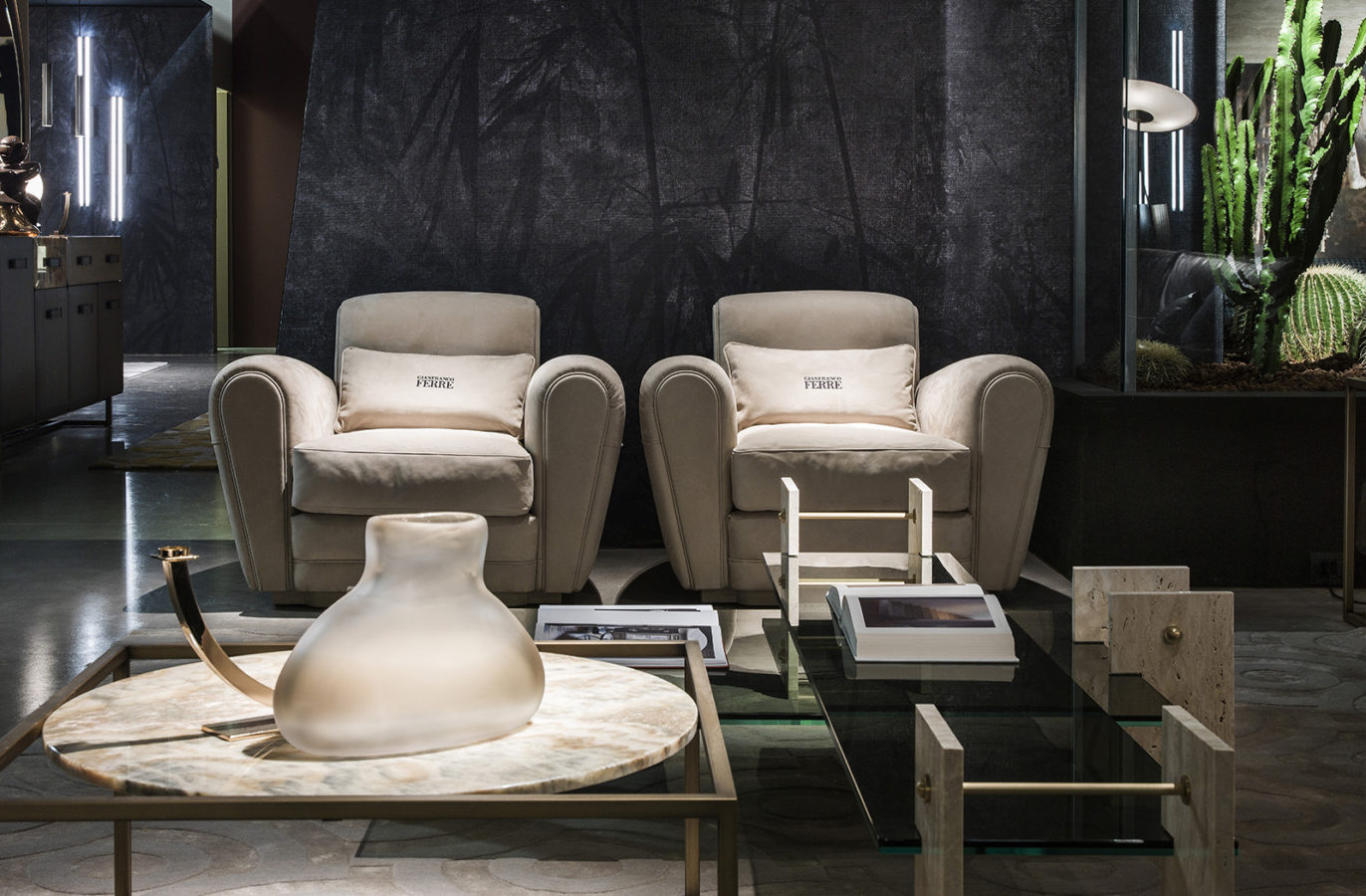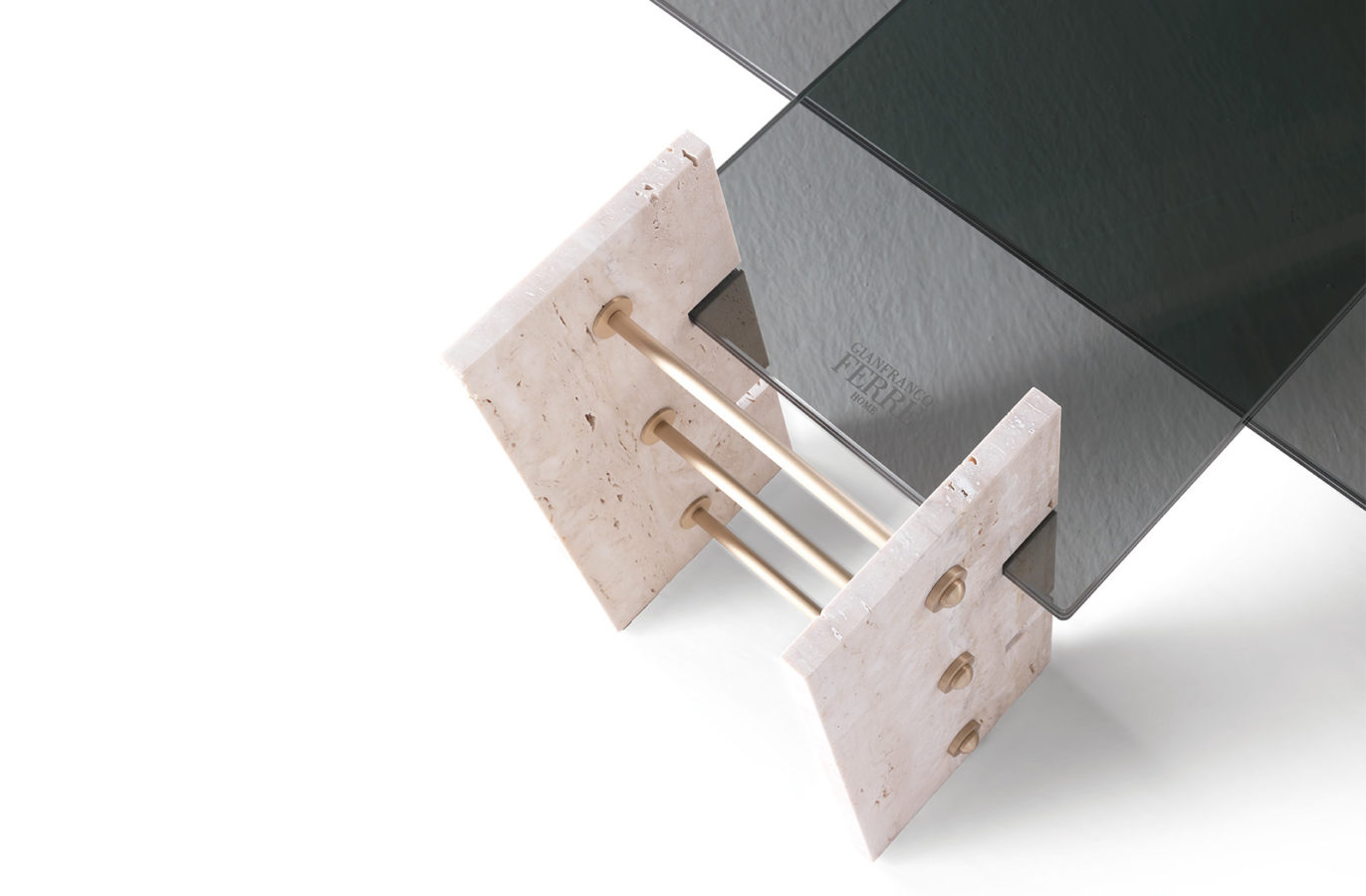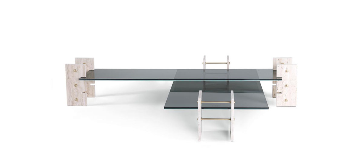 Fitzroy系列由书柜,控制台和咖啡桌组成,是贯穿整个系列的工业风格的缩影。这些具有20世纪70年代感觉的作品让人想起机械装置的形状,由石灰华,黄铜和烟熏玻璃制成。中央桌子,结构采用开孔石灰华石大理石制成。哑光黄铜结构条。带徽标的耦合玻璃台面(超透明+烟熏)GF。