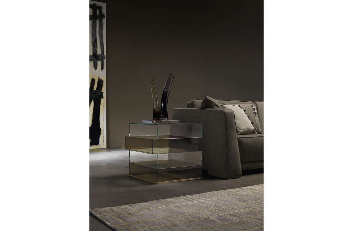 纯粹的体积和基本线条:这些是Jenga控制台的主要功能。具有精致设计的构图,表现为连续的浅色和深色玻璃矩形,以45°组装并在不显示移植物或接头的情况下连接在一起。整个结构由玻璃制成,整个作品以独特的轻盈和精致的块状呈现给人以。在一场令人惊讶的颜色和几何游戏中,明暗玻璃的组合今年在新的色彩调色板中被重新诠释,结合了缎面超透明和烟熏玻璃。中央桌子由青铜色和透明玻璃中的交替平行六面体制成,不规则地排列。这些元件通过使用UV胶水以45°无接头的方式组装。圆柱形黄铜支脚。