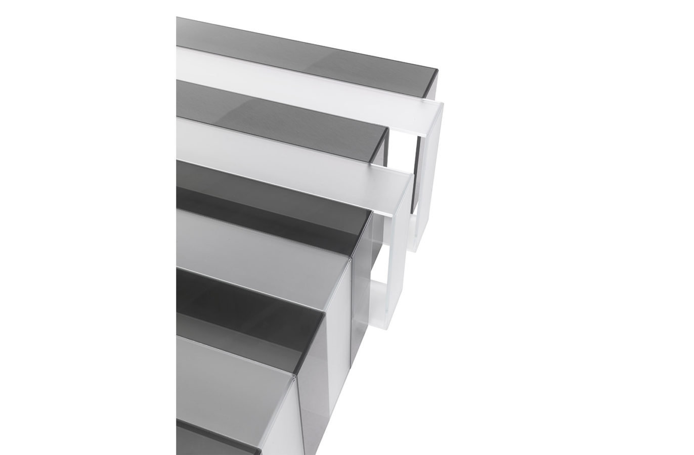纯粹的体积和基本线条:这些是Jenga中央桌子的主要特征。具有精致设计的构图,表现为连续的浅色和深色玻璃矩形,以45°组装并在不显示移植物或接头的情况下连接在一起。整个结构由玻璃制成,整个作品以独特的轻盈和精致的块状呈现给人以。在一场令人惊讶的颜色和几何游戏中,明暗玻璃的组合今年在新的色彩调色板中被重新诠释,结合了缎面超透明和烟熏玻璃。中央桌子采用烟熏和缎面超透明玻璃结构。古铜色饰面的提示。