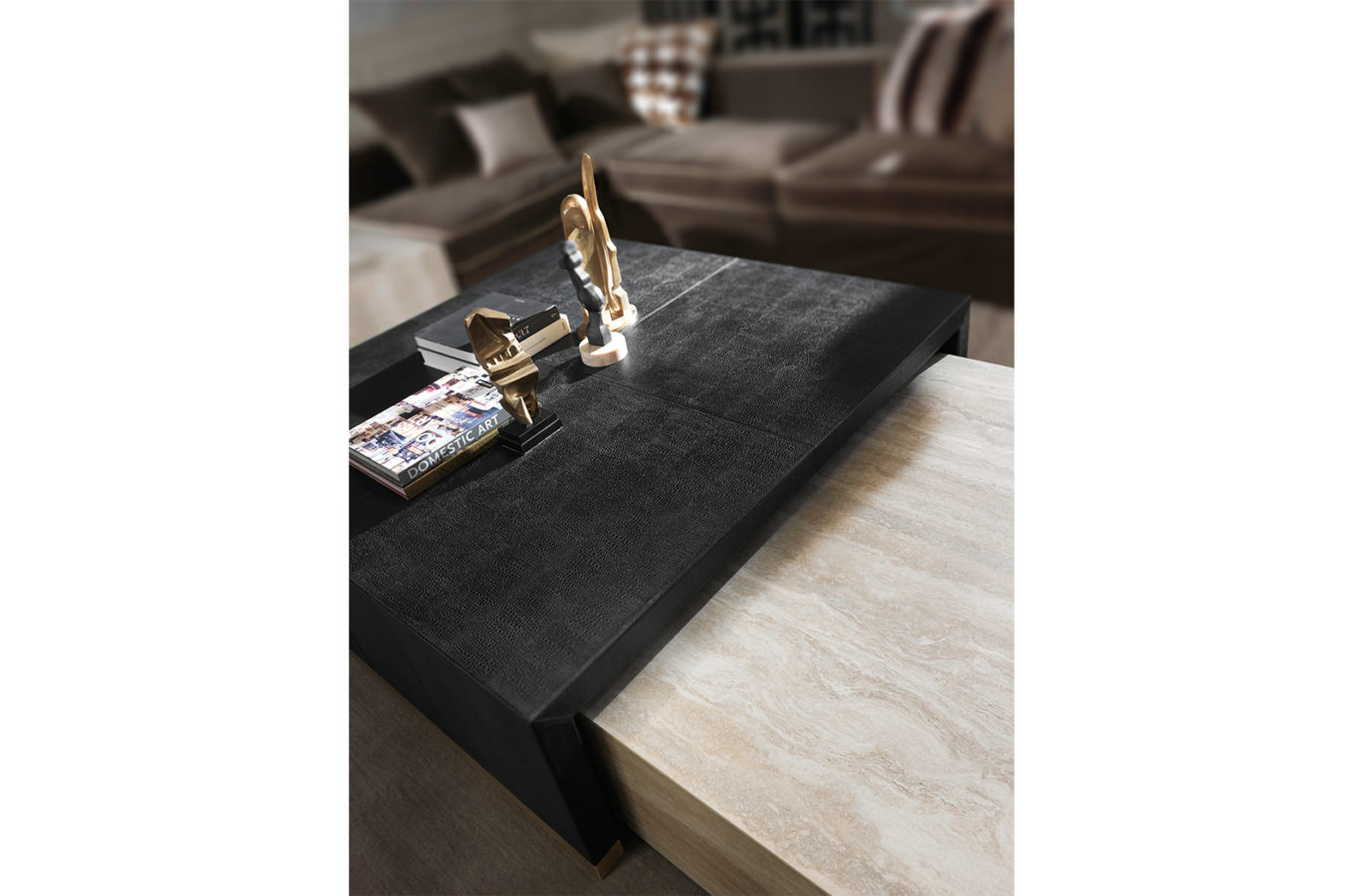 皮革和金属:对比鲜明的纹理和材料,采用简约而精致的设计,其特点是柔软的皮革内饰和底座的青铜饰面。与 Flair 表的组合允许您创建原始几何构图。中央桌子,结构为多层杨树,覆盖着皮革猫B|L.06.01. 金属底座,镀铜色表面处理。